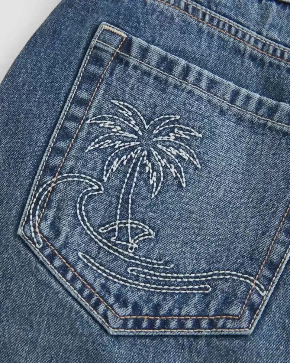 A cute denim mini skort designed with a low-rise waist and hidden knit shorts. Medium wash with fading and whiskering, beach and surf embroidery on the front pocket and back right waist. Imported.