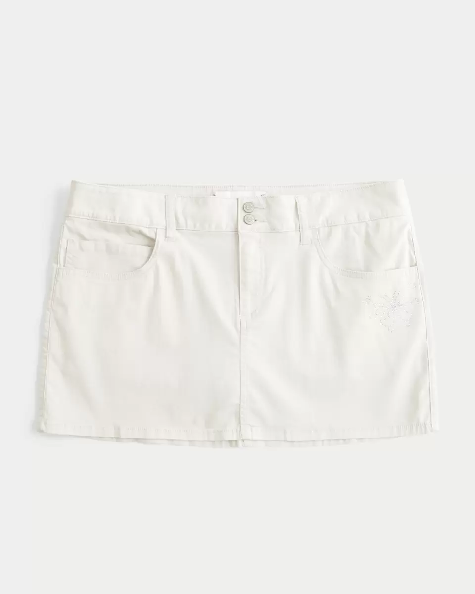 A cute twill mini skort designed with a low-rise waist and hidden knit shorts. Pretty butterfly graphic in shine details at left pocket. Imported.