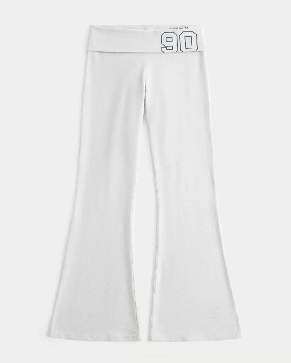 Super soft fleece pants with a mid-rise foldover waist featuring a number graphic. Flared hem.
