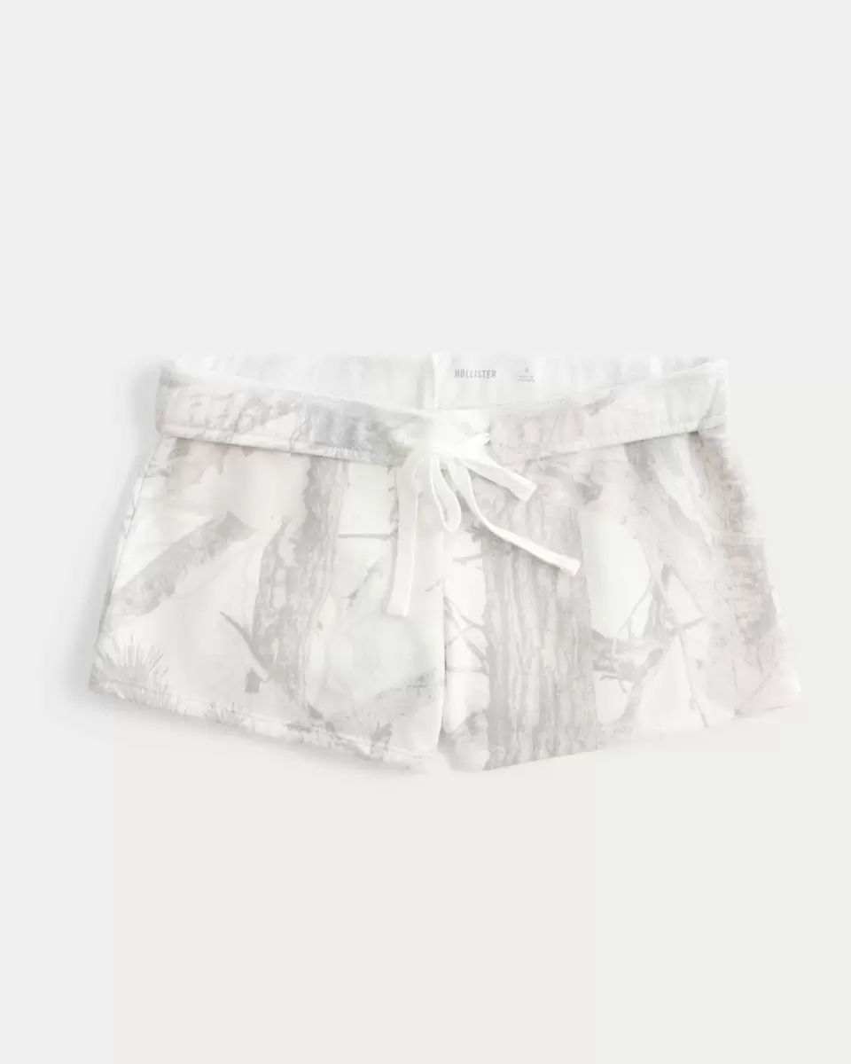 Super soft fleece mini shorts with a drawstring waist that looks cute folded over. All-over camo pattern. Imported.