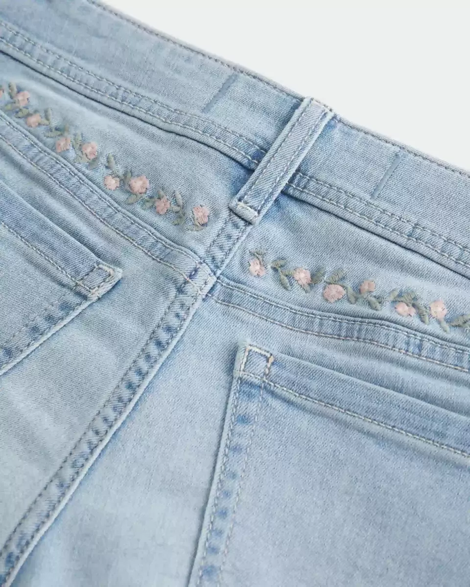 Cute and comfy denim shorts in a light wash, designed with a curvy low-rise waist and shortie short fit. Fading, floral embroidery at right coin pocket and back. Imported.