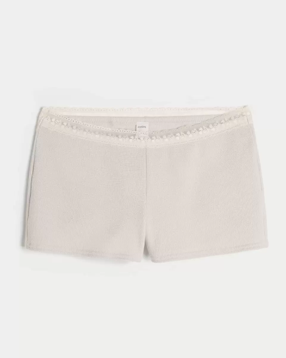 Super soft and comfy shortie shorts in waffle fabric with pretty lace trim at the waist. Imported.