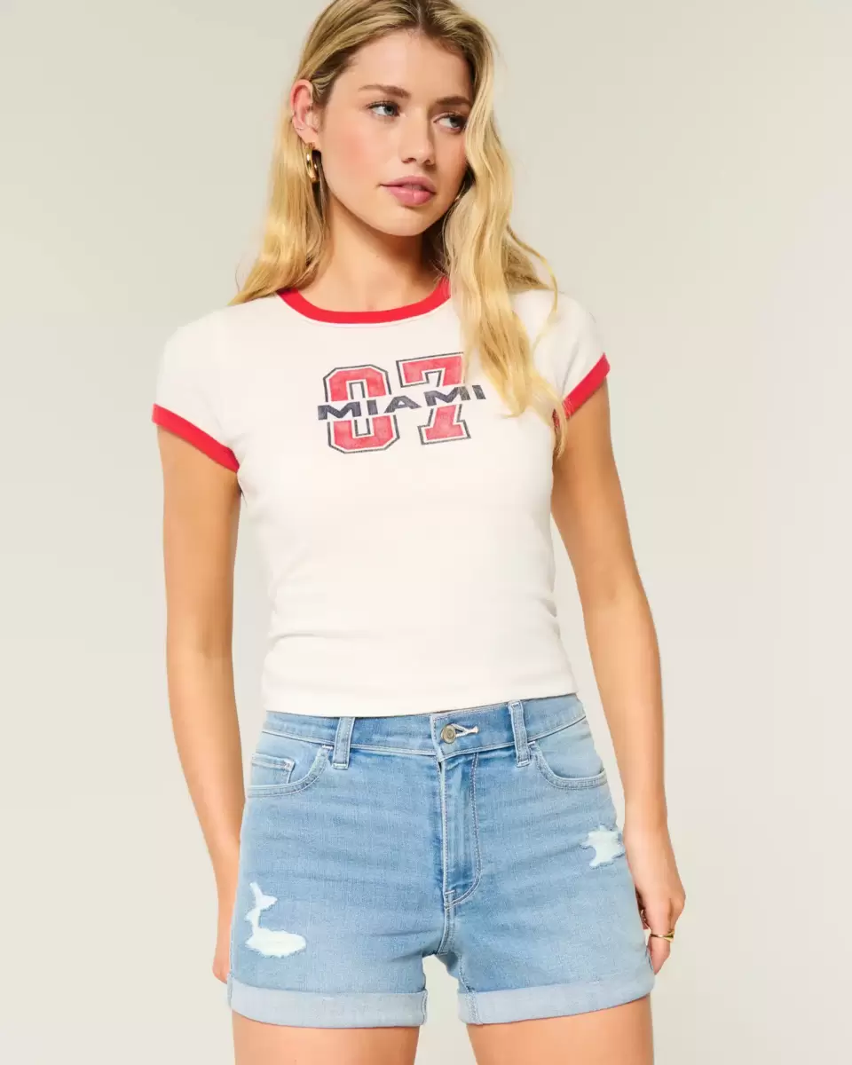 Cute denim shortie shorts designed with a flattering high-rise waist. Medium light wash with fading, whiskering and ripped details. Cuffed hems, super comfortable Soft Stretch denim. Imported.