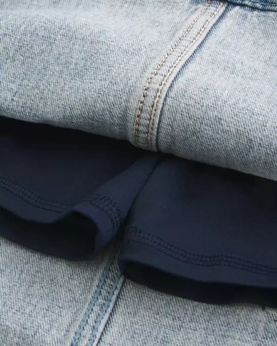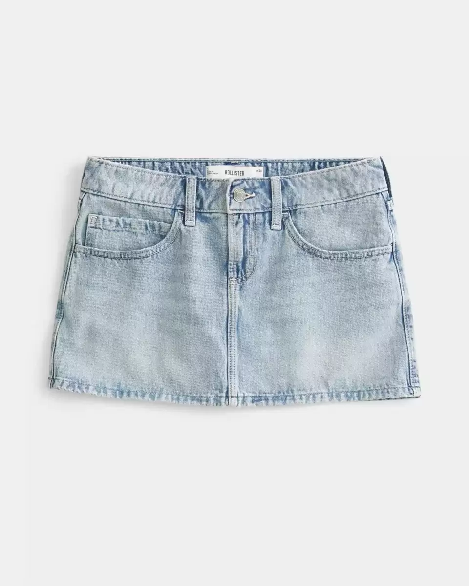 A cute denim mini skort designed with a low-rise waist and hidden knit shorts. Light wash with fading and whiskering.