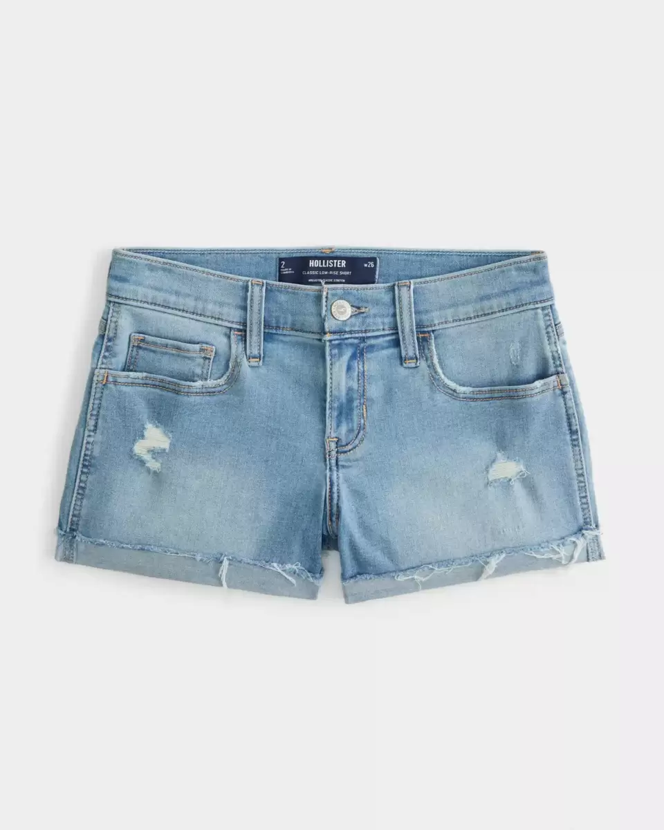 Cute denim shorts in a light wash with distressed detailing, fading and cuffed hems. Low-rise waist. Imported.