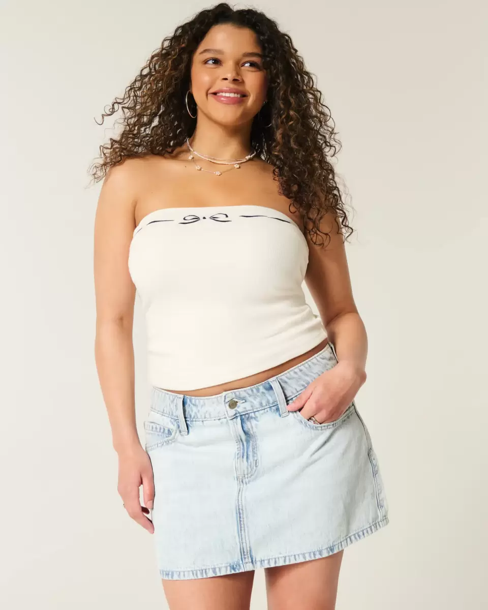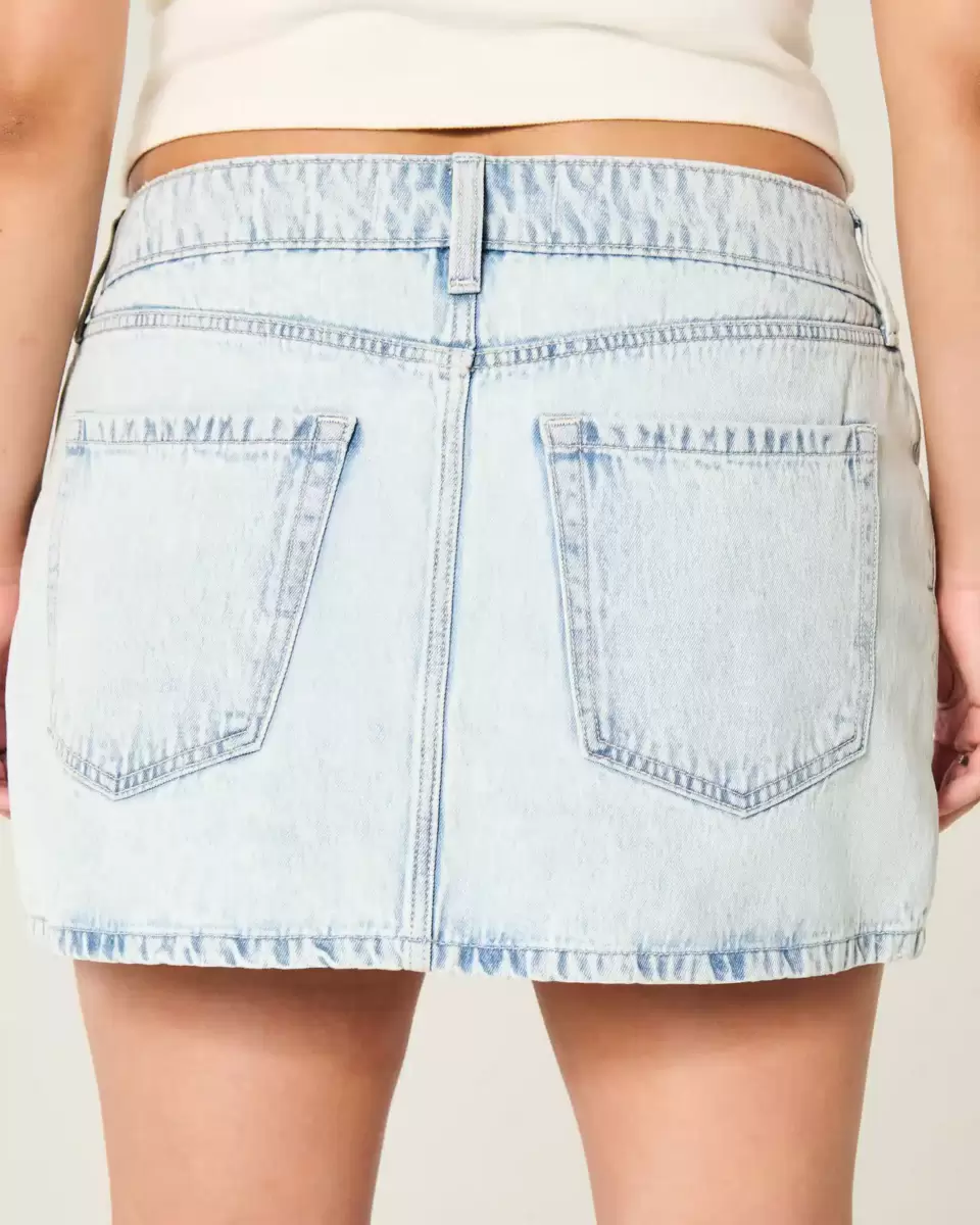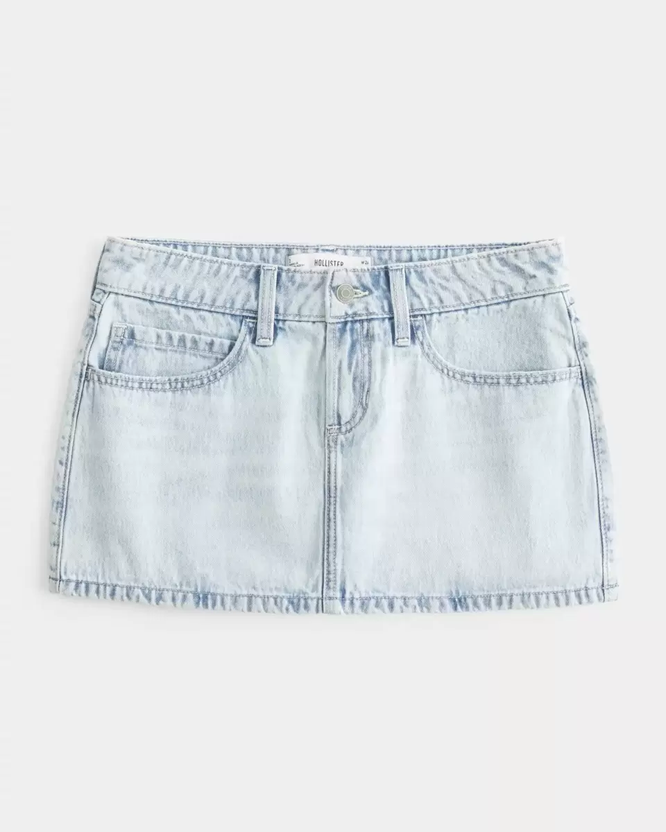 A cute skort in denim, featuring hidden knit shorts. Flattering low-rise waist, pockets, light wash denim. Imported.