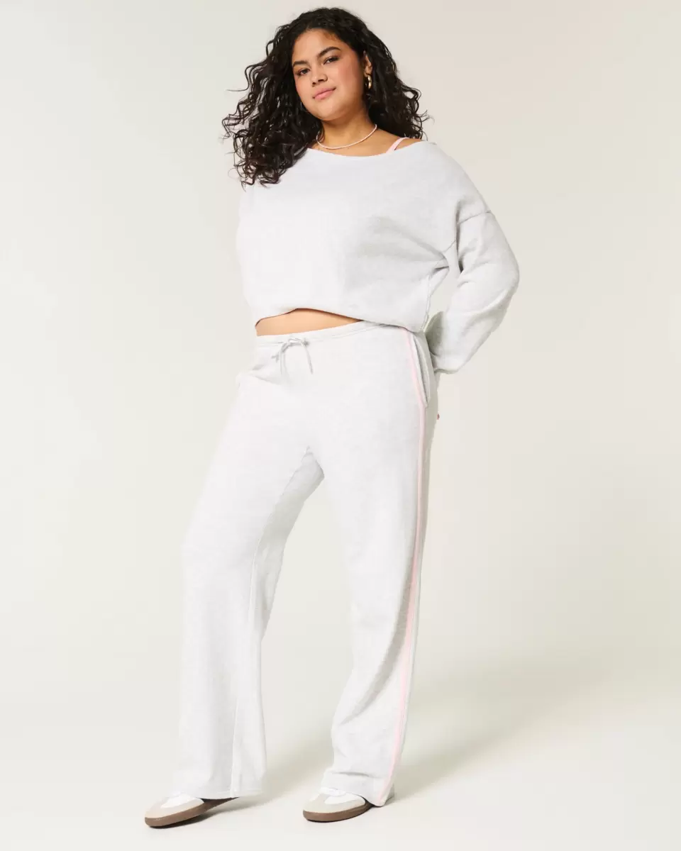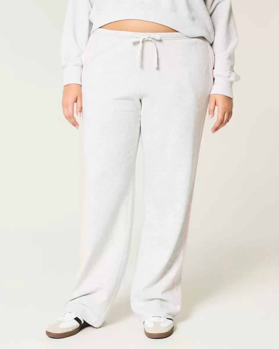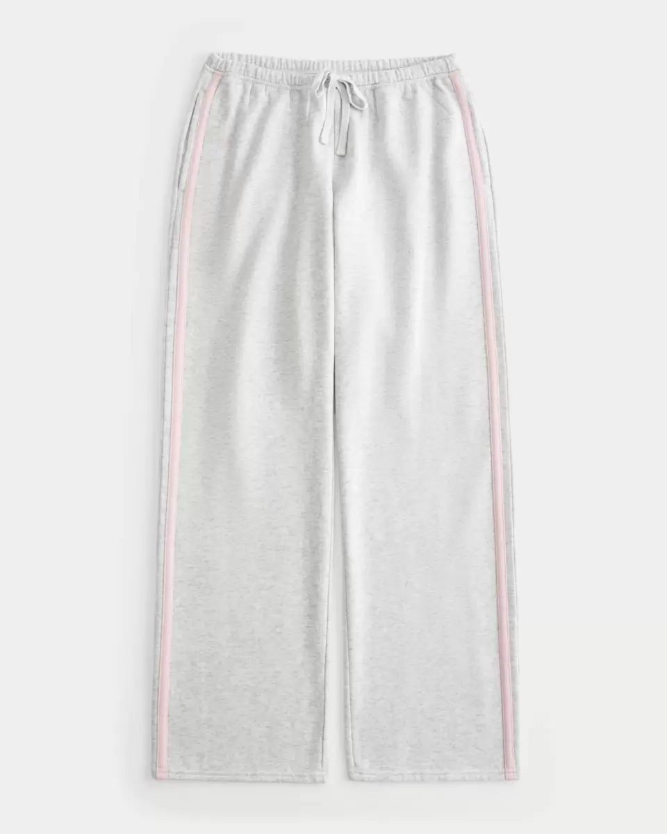 Super soft fleece sweatpants with a straight leg and sporty stripes along the sides. Soft drawstring waist, pockets.
