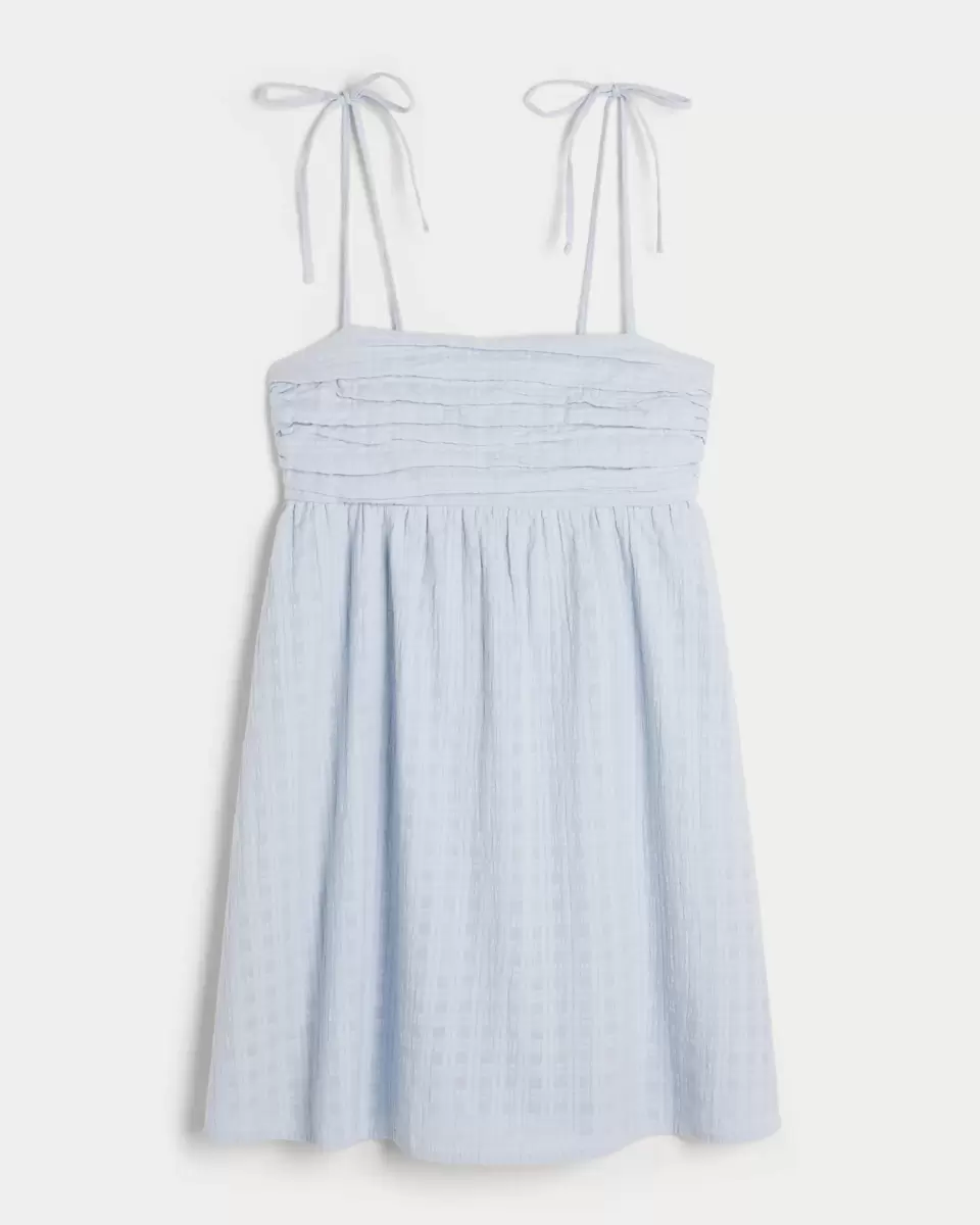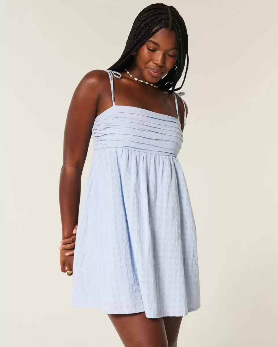 Made with super soft crosshatch fabric, this flowy mini dress features ruched detailing through the bust and cute tie shoulder straps.