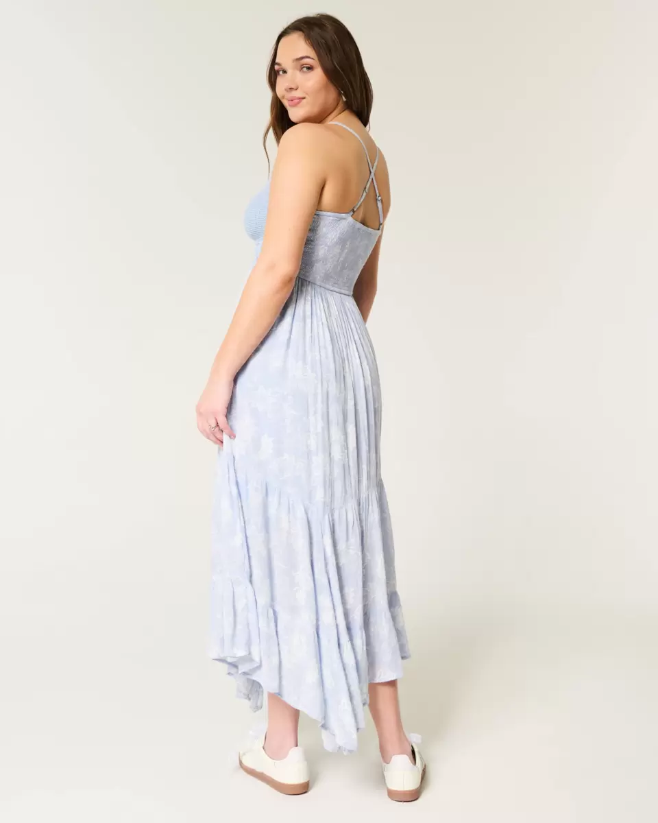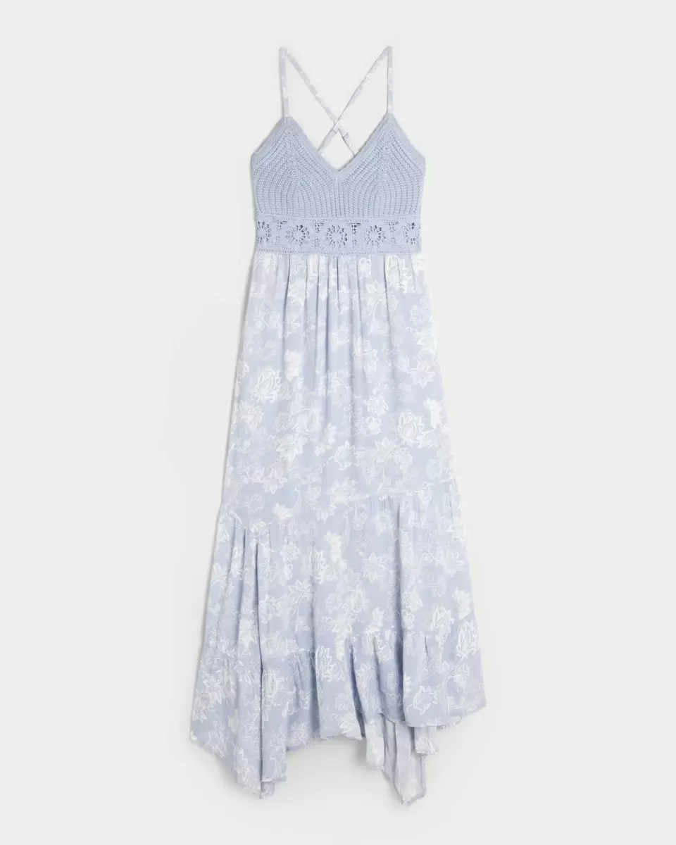 This pretty maxi-length dress features fabric mixing with a super soft crochet-style bodice and flowy woven skirt. Cute stitched patterns, asymmetrical hem, v-neck, adjustable cros
