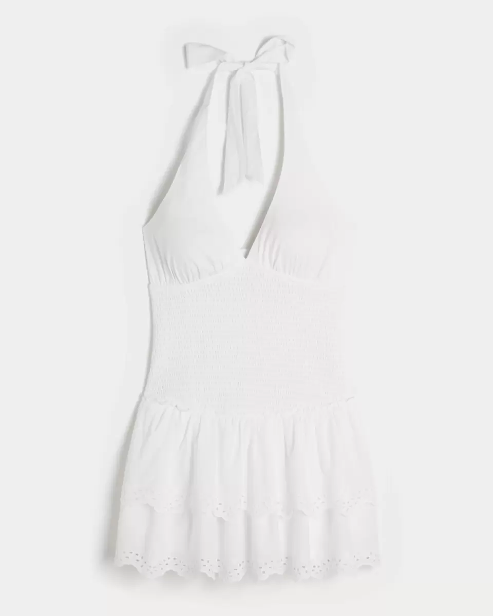 This cute skort dress features a double-tiered skirt and soft smocked waist. Built-in shorts with pocket, removable pads, halter straps. Imported.