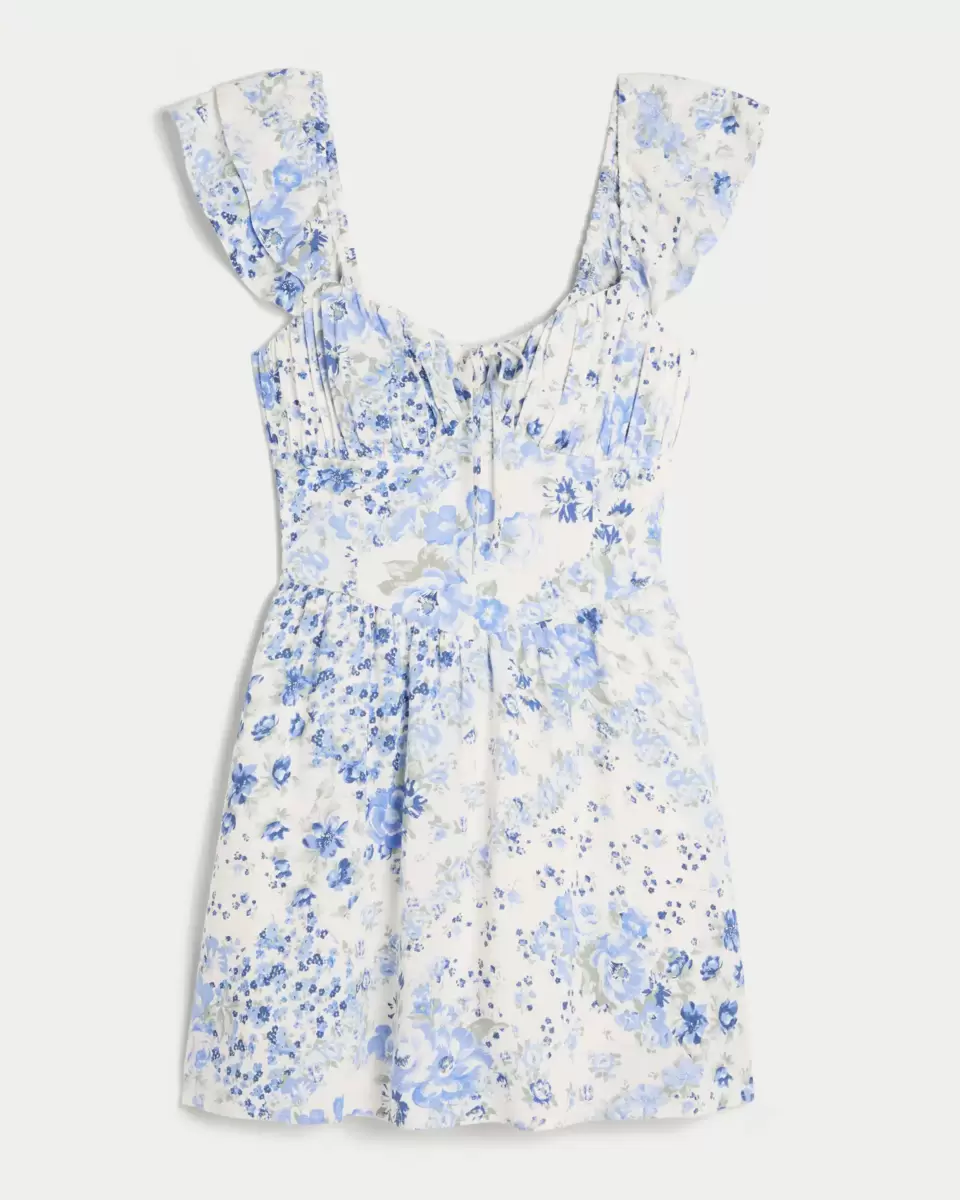 Pretty and super soft, this dress features ruched detailing through the bust, a front tie detail and tiered flutter sleeves. Bra-covering back detail, flowy skirt, hidden shorts, pockets. Imported.