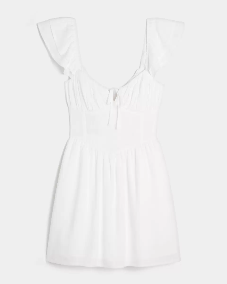 Pretty and super soft, this dress features ruched detailing through the bust, a front tie detail, and double flutter sleeves. Bra-covering back detail, flowy skirt, hidden shorts, pockets. Imported.