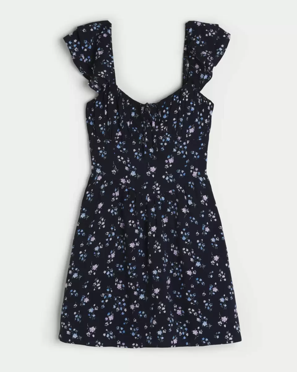 Pretty and super soft, this dress features ruched detailing through the bust, a front tie detail, and double flutter sleeves. Bra-covering back detail, flowy skirt, hidden shorts, pockets. Imported.