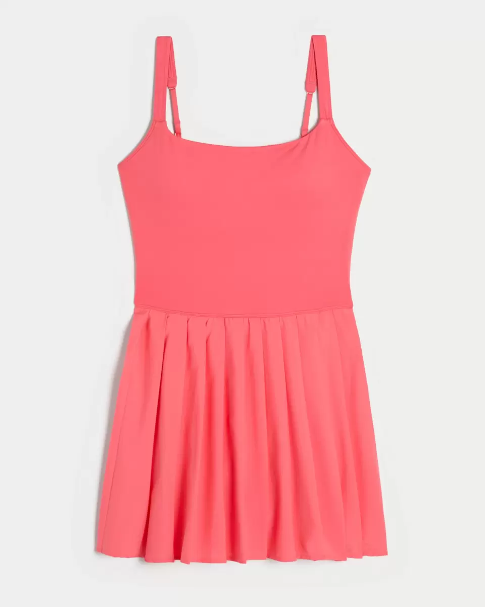 This cute and comfy active dress features a built-in shelf bra with removable pads and built-in bathroom-friendly shorts. Adjustable straps, pretty pleated skirt.