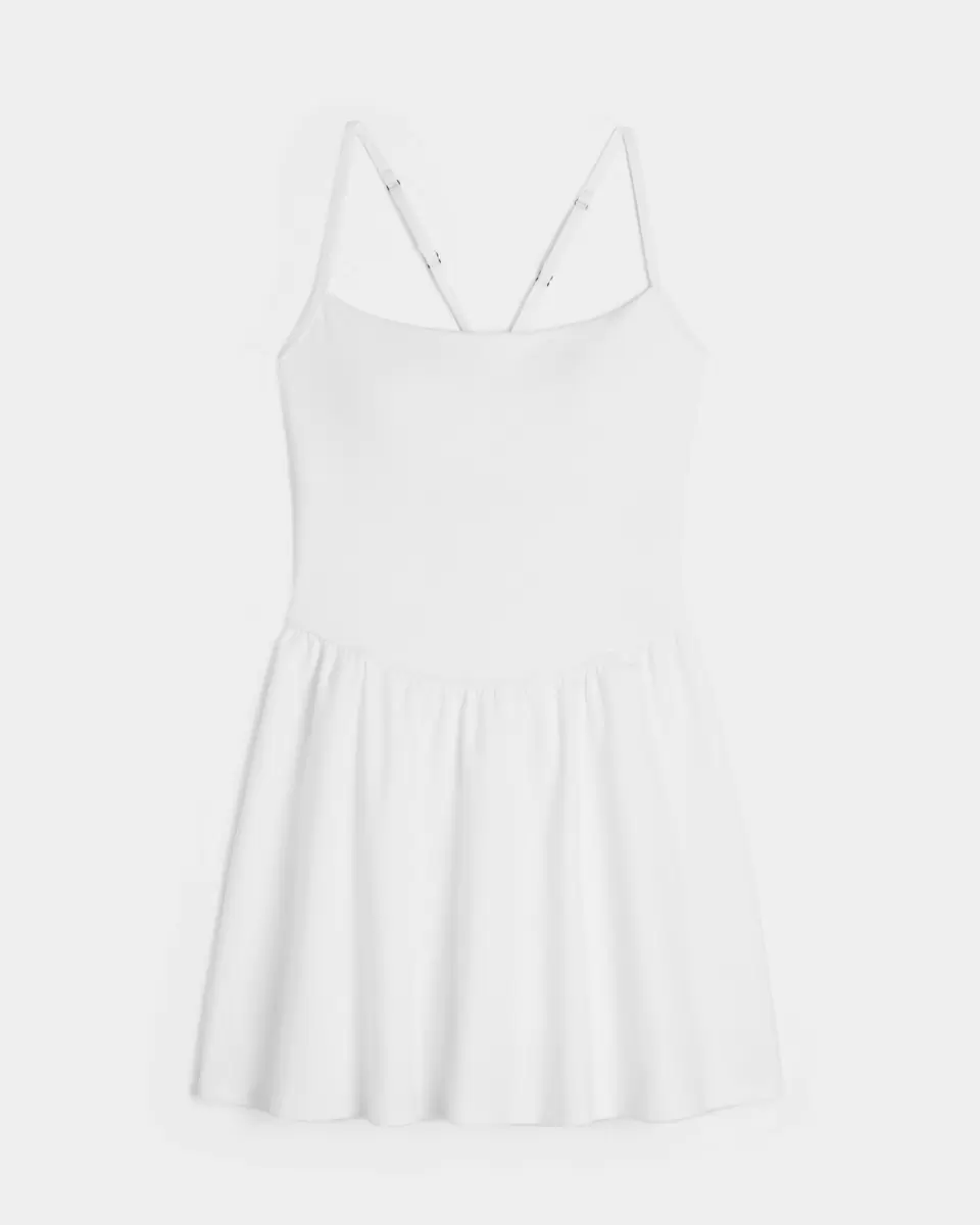 This super cute dress is made with soft active fabric and features built-in shorts with pocket. Strappy back, adjustable straps. Imported.