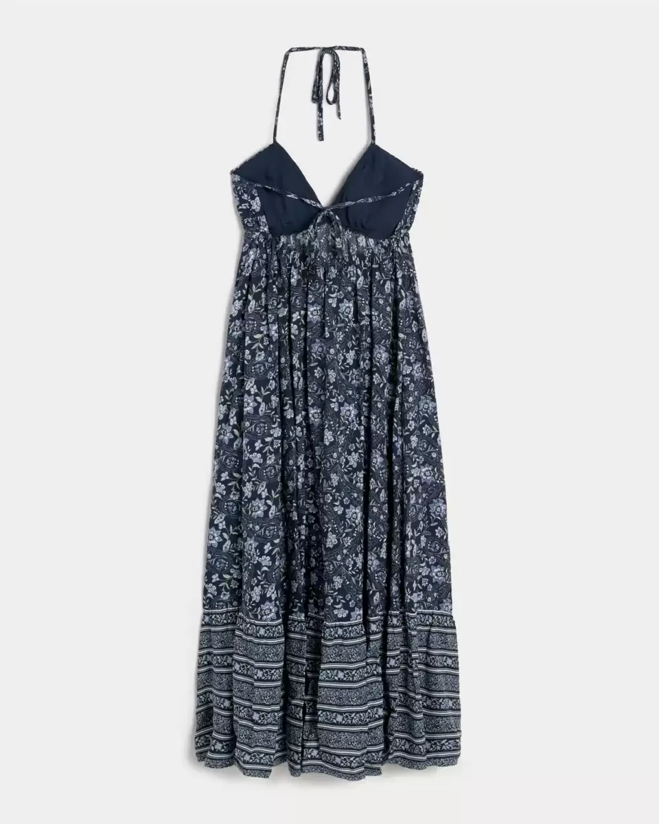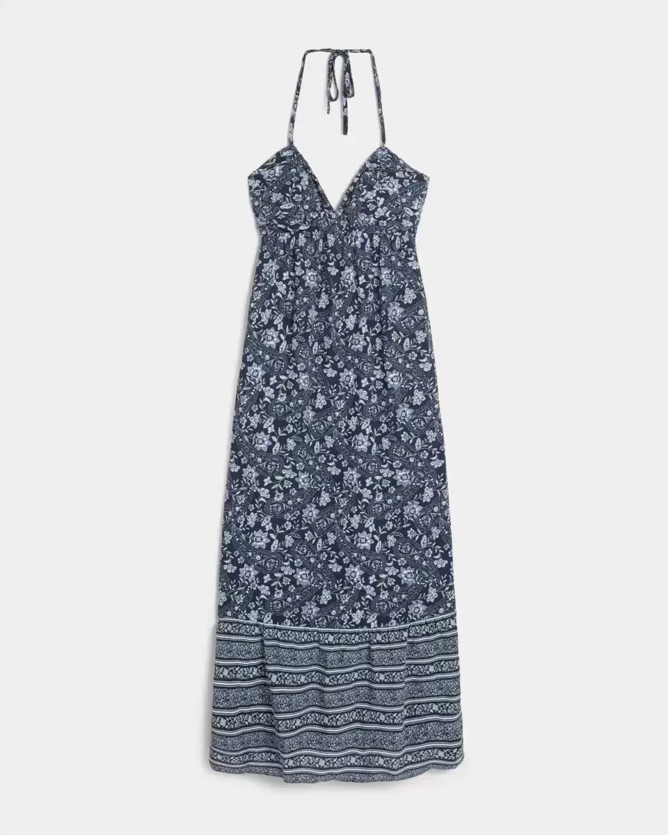Super soft, flowy and fun, this dress features halter straps, pockets and a back tie detail. Removable pads, tiered hem, maxi length. Imported.