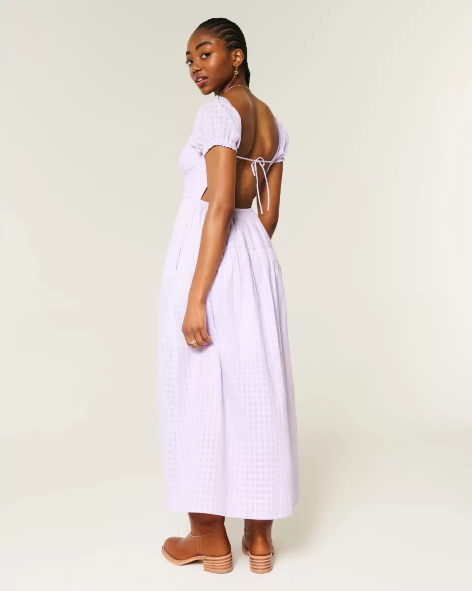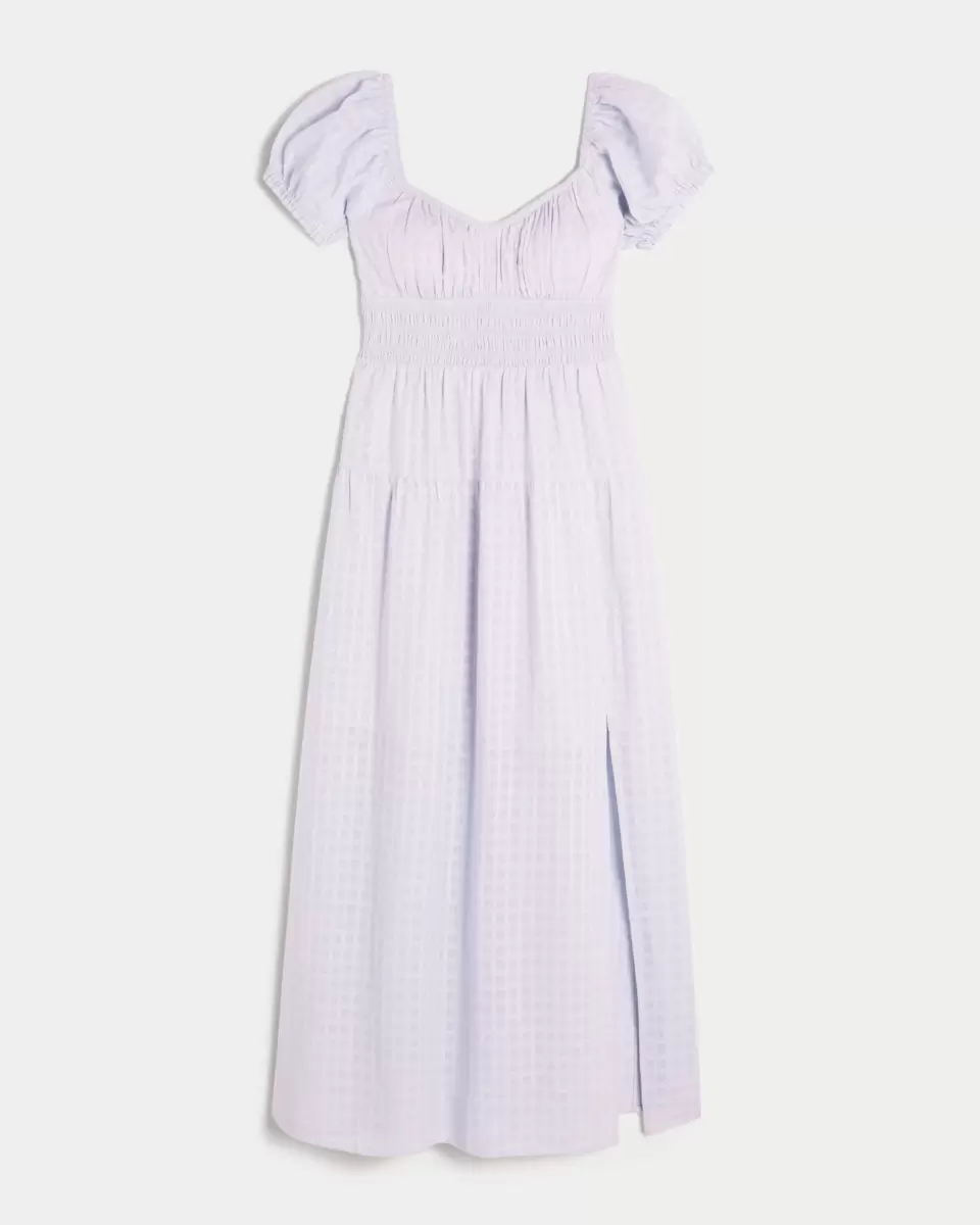 A pretty and super soft maxi-length dress with an open back detail and removable pads. Short sleeves, pockets, soft smocked waist, split hem detail. Imported.
