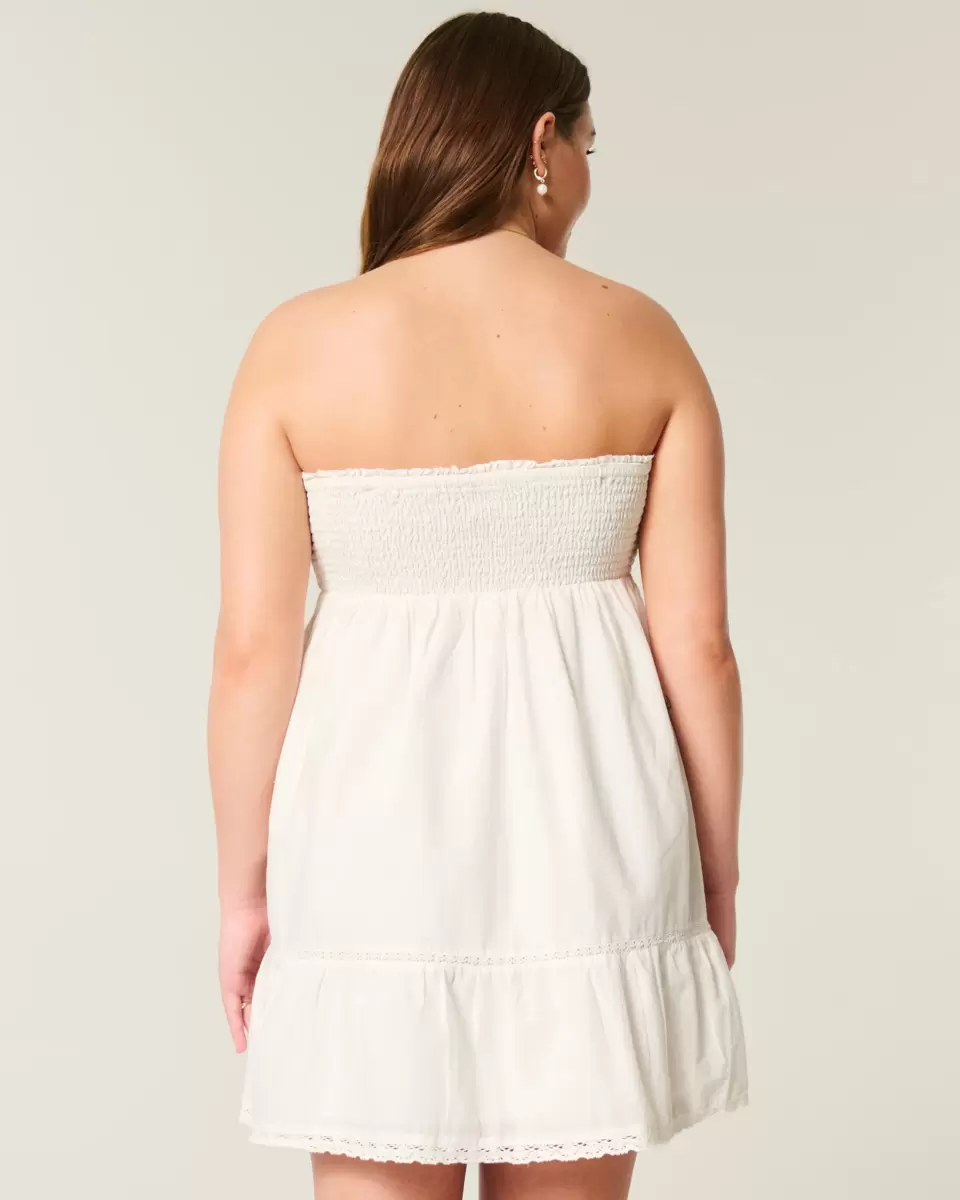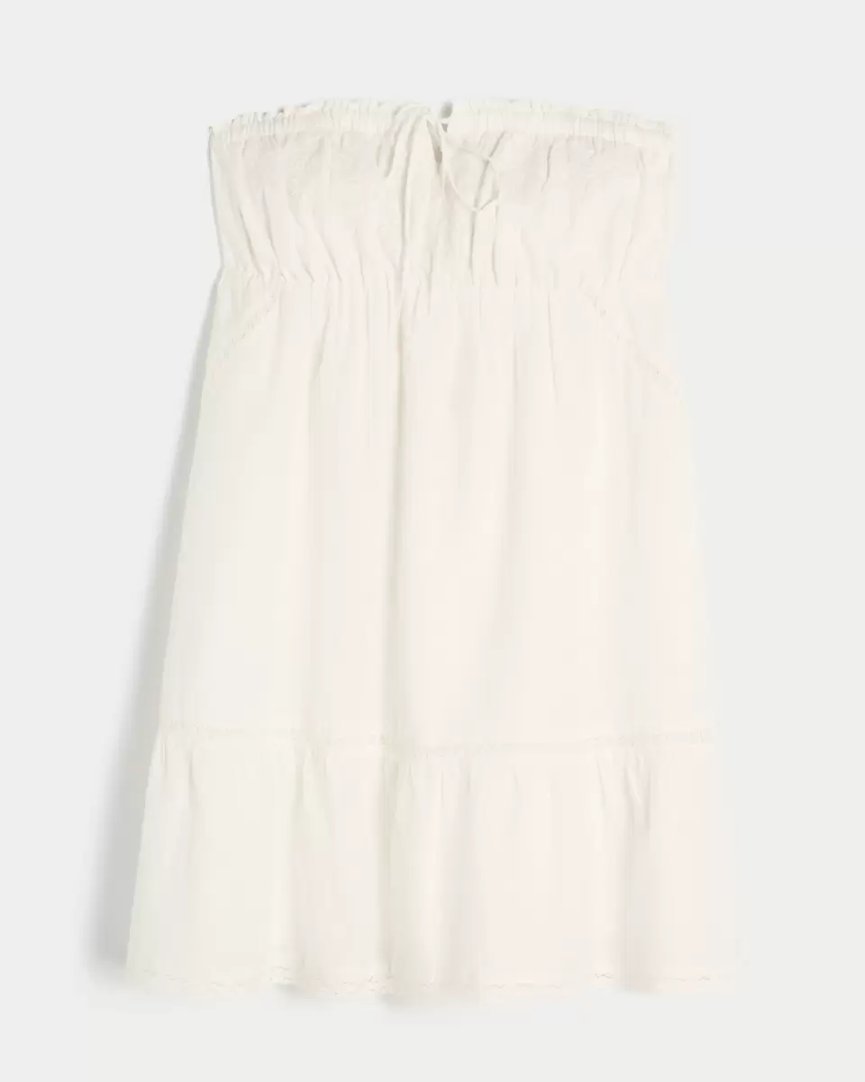 Flowy and super soft, this strapless dress features a tie at the neckline and pretty embroidered details at the bust. Pretty lace insets. Imported.