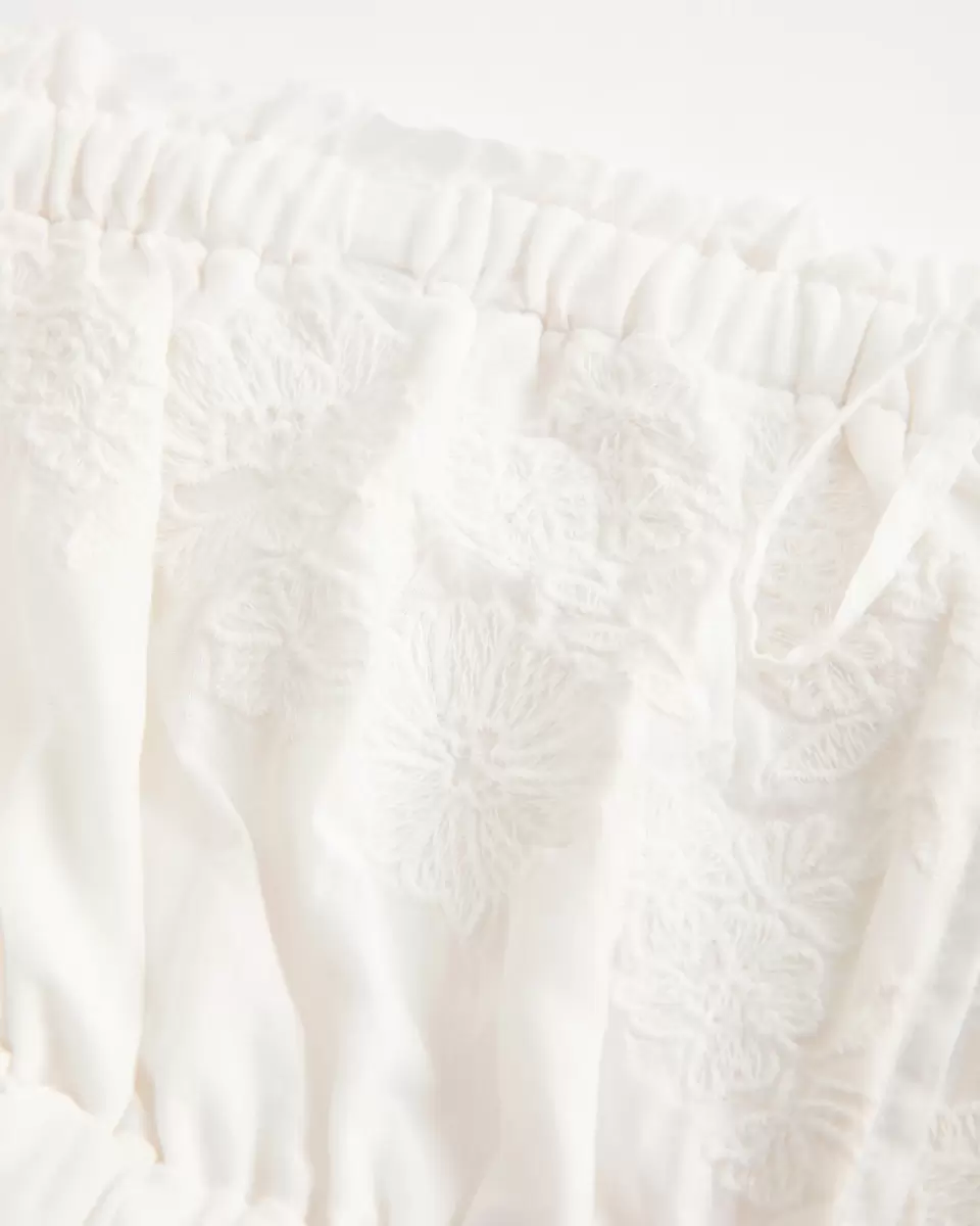 Flowy and super soft, this strapless dress features a tie at the neckline and pretty embroidered details at the bust. Pretty lace insets.