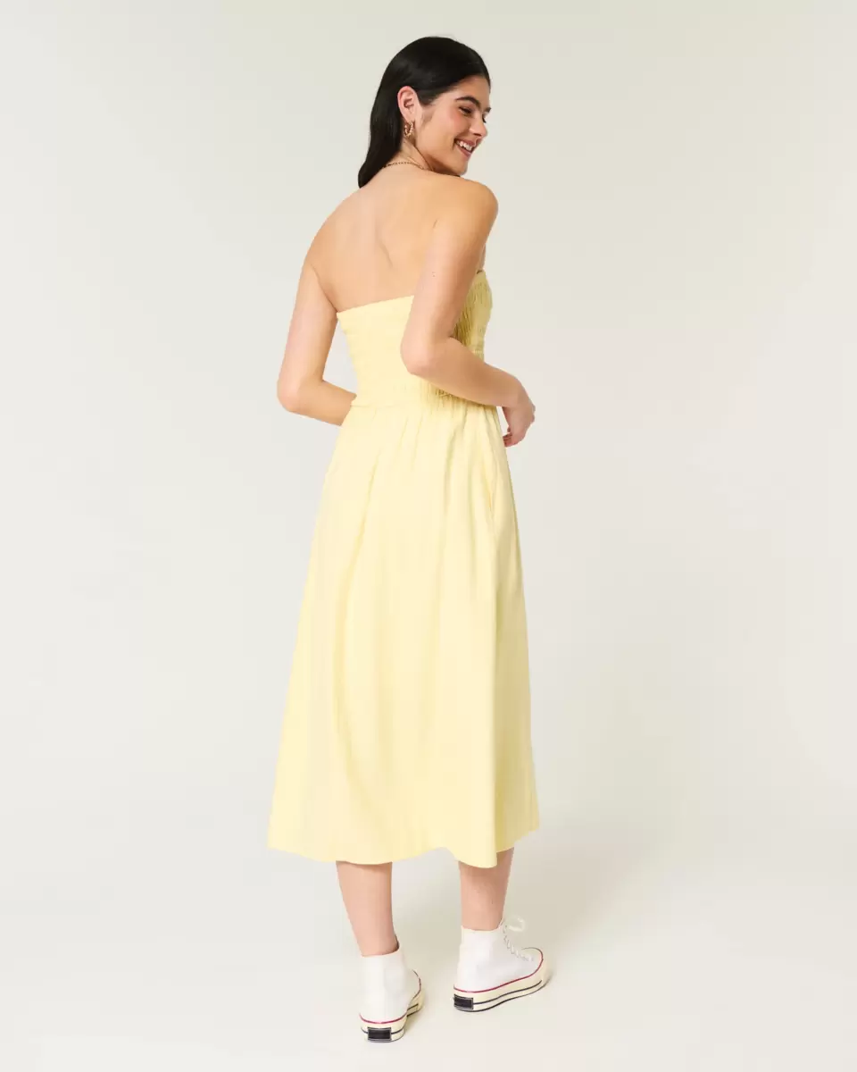This easy throw-on-and-go strapless dress is designed with a soft smocked bust and midi length. Split hem detail, soft linen-blend fabric, pockets.