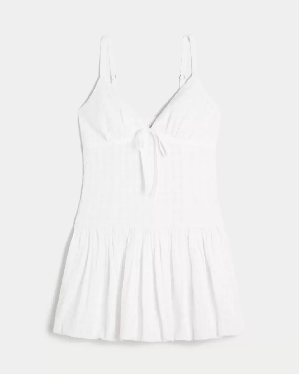 A super soft and pretty v-neck mini dress with a bubble hem, adjustable skinny straps and drop waist. Pretty tie detail, pockets, built-in shorts.