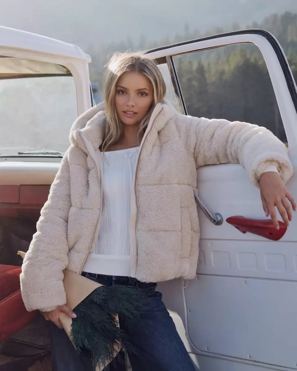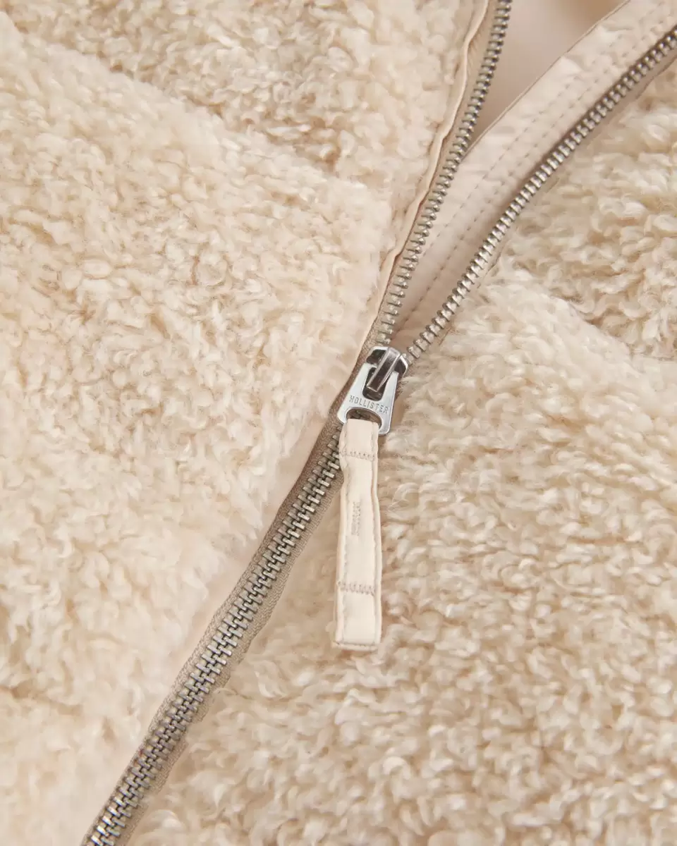 Your new fave jacket features quilted channels, front pockets, a full zip-up closure and interior pockets. Super soft sherpa exterior, fully lined, removable hood. Imported.