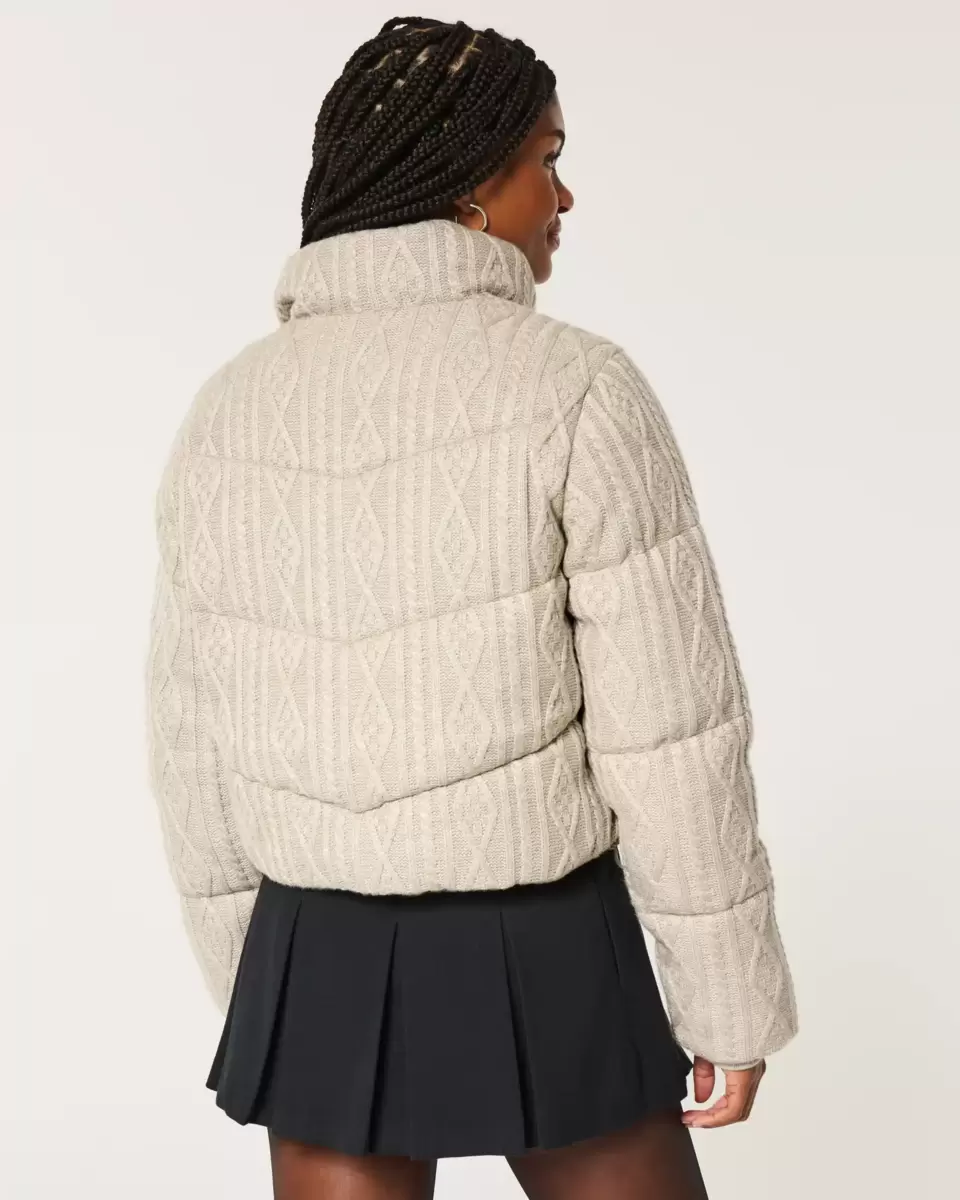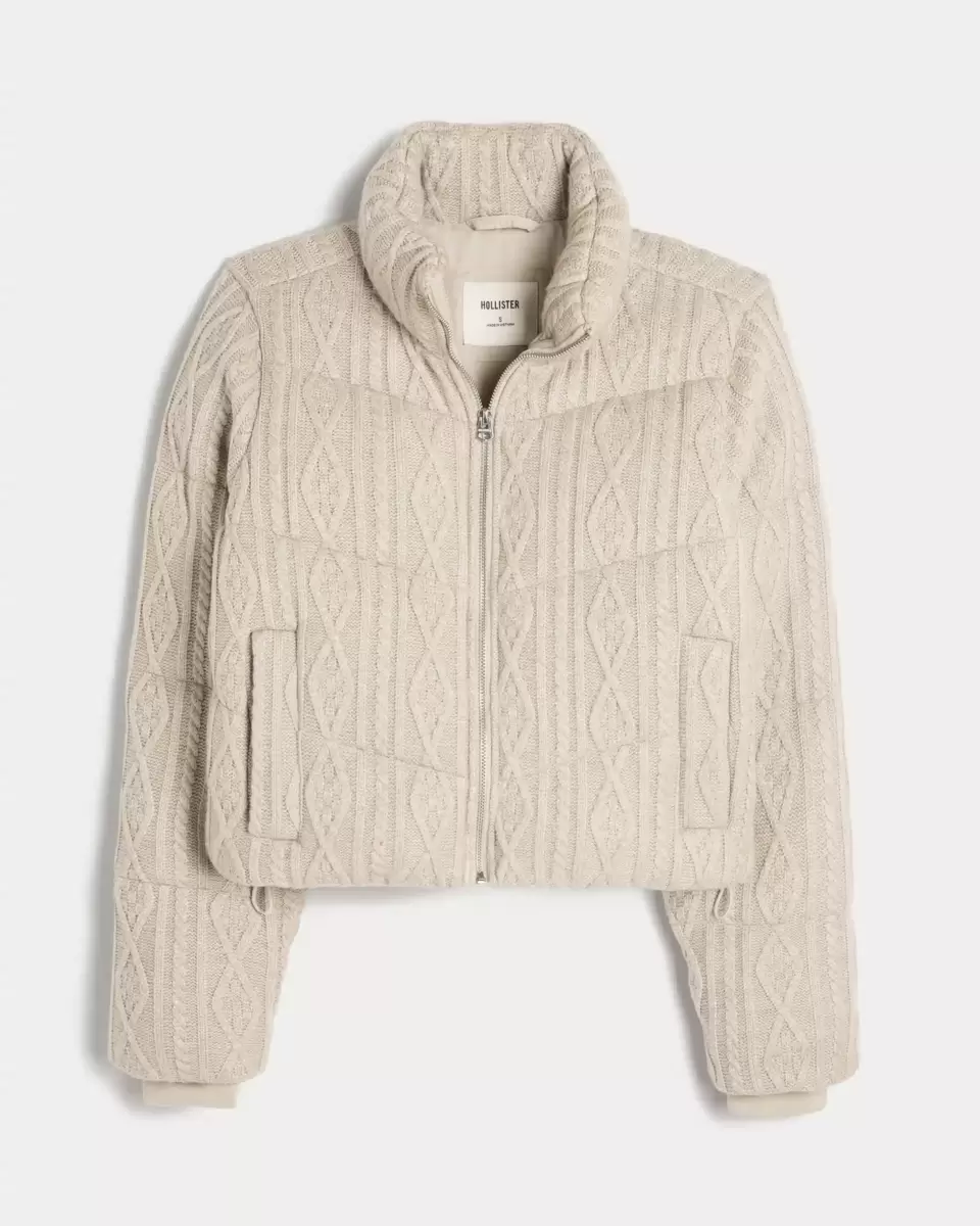 This cute and cozy mini puffer jacket is made with soft sweater-knit fabric with cable-knit patterns and quilted channels. Full zip-up closure, mock-neck collar, pockets, drawcord