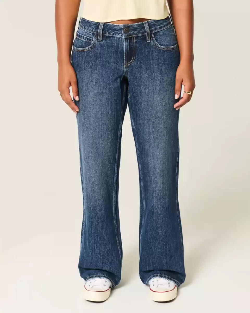 Comfortable denim jeans in a dark wash, designed with a flattering low-rise waist and baggy leg. Fading. Imported.