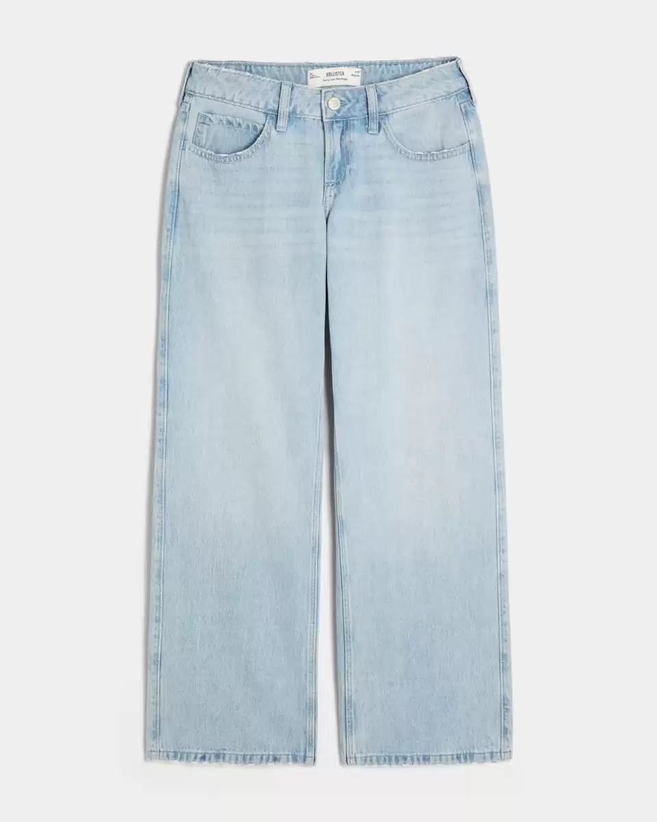 These comfy jeans designed with a low-rise waist and baggy leg. Light wash with fading and whiskering. Imported.