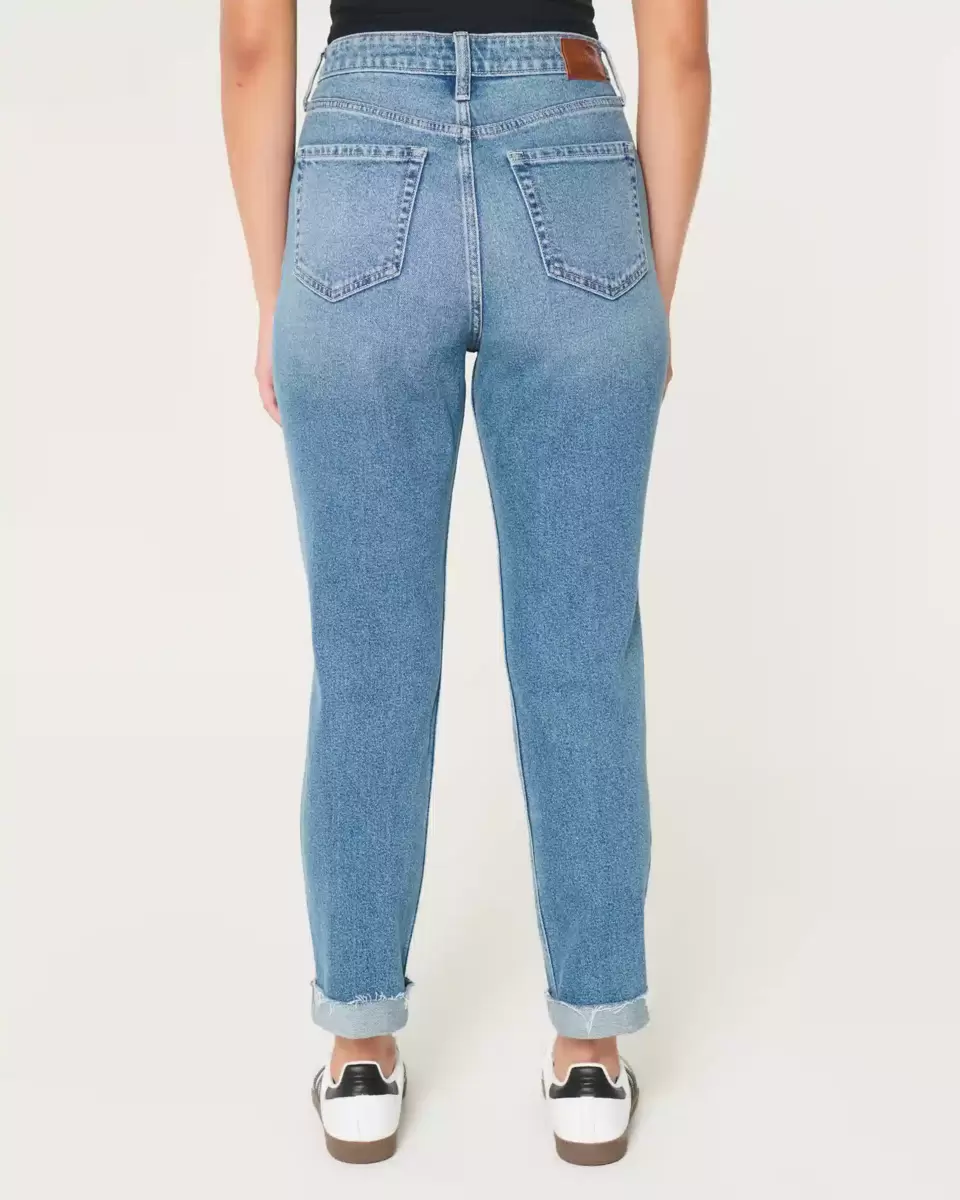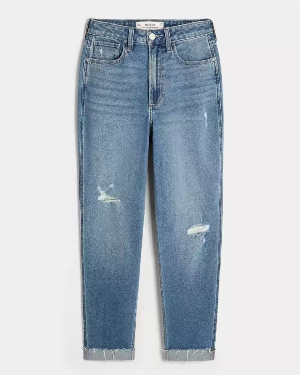 Designed with a relaxed leg and an ultra high-rise waist with fading, whiskering and ripped details. Cuffed hems, ultra-comfortable Vintage Stretch denim in a medium wash. Imported.