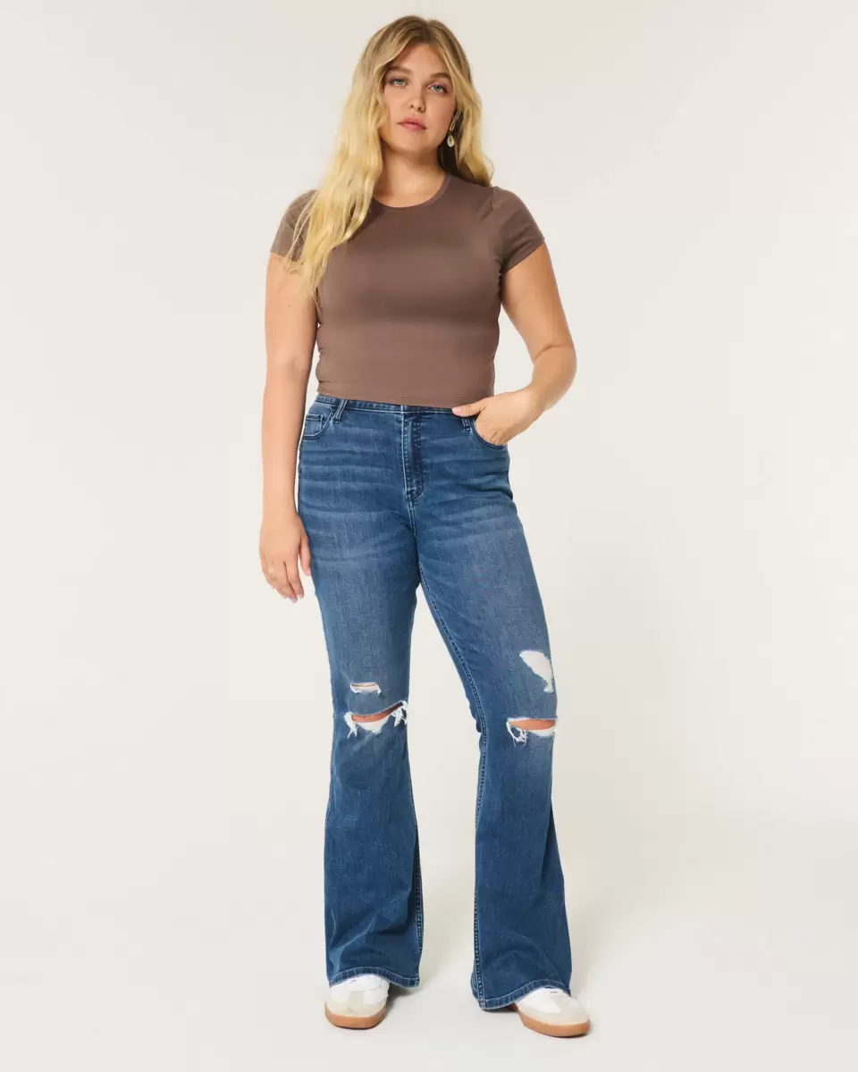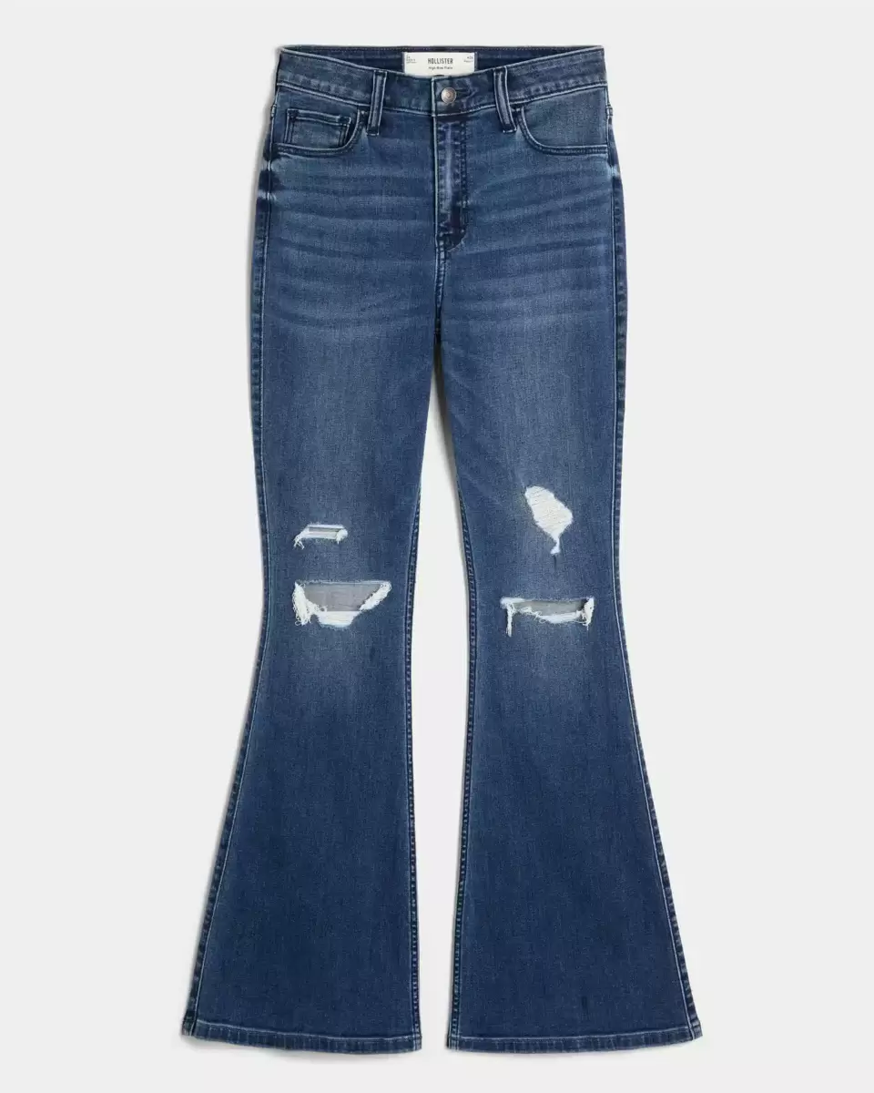 Cute and comfy jeans with stretch in a medium wash with fading, whiskering and ripped detailing. Slim through the leg with a flared hem, high-rise waist. Imported.