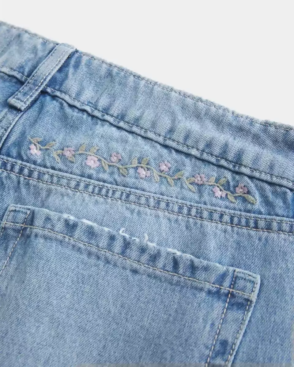 Comfortable denim jeans designed with a low-rise waist and baggy leg. Medium wash denim with fading and whiskering. Floral embroidery at the right coin pocket and back pocket. Imported.