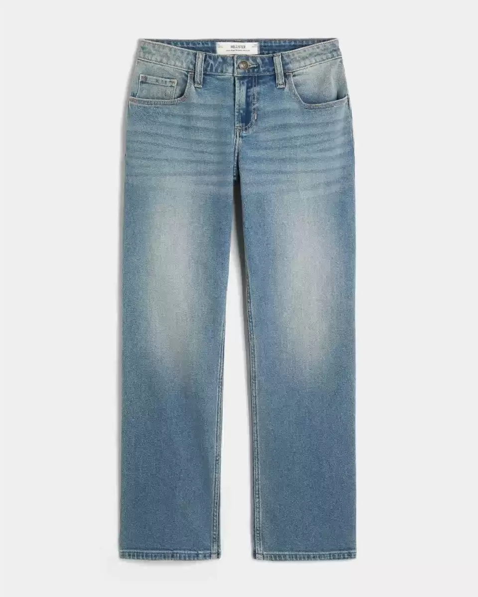 Ultra-comfortable jeans in medium wash denim, designed with a low-rise waist and relaxed straight leg. Fading and whiskering. Imported.