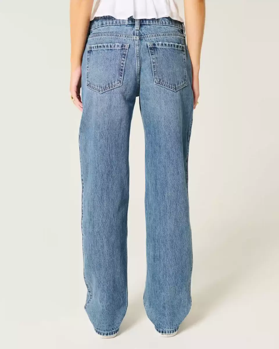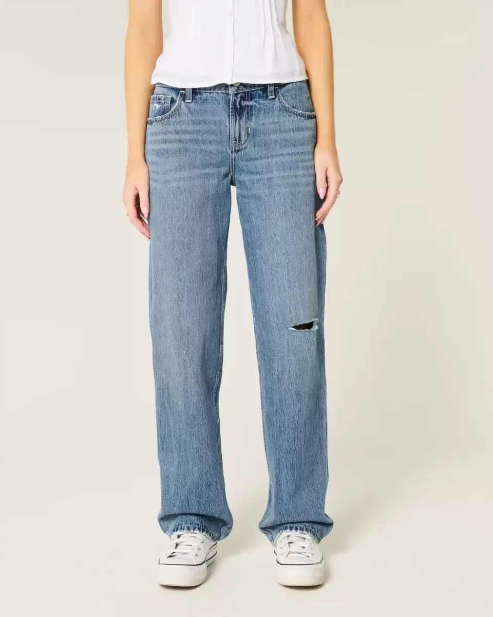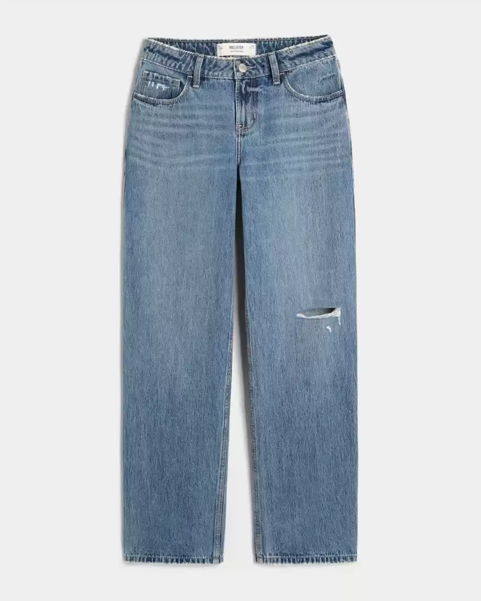 Comfortable denim jeans designed with a low-rise waist and loose leg. Fading, whiskering, ripped detailing, medium wash. Imported.