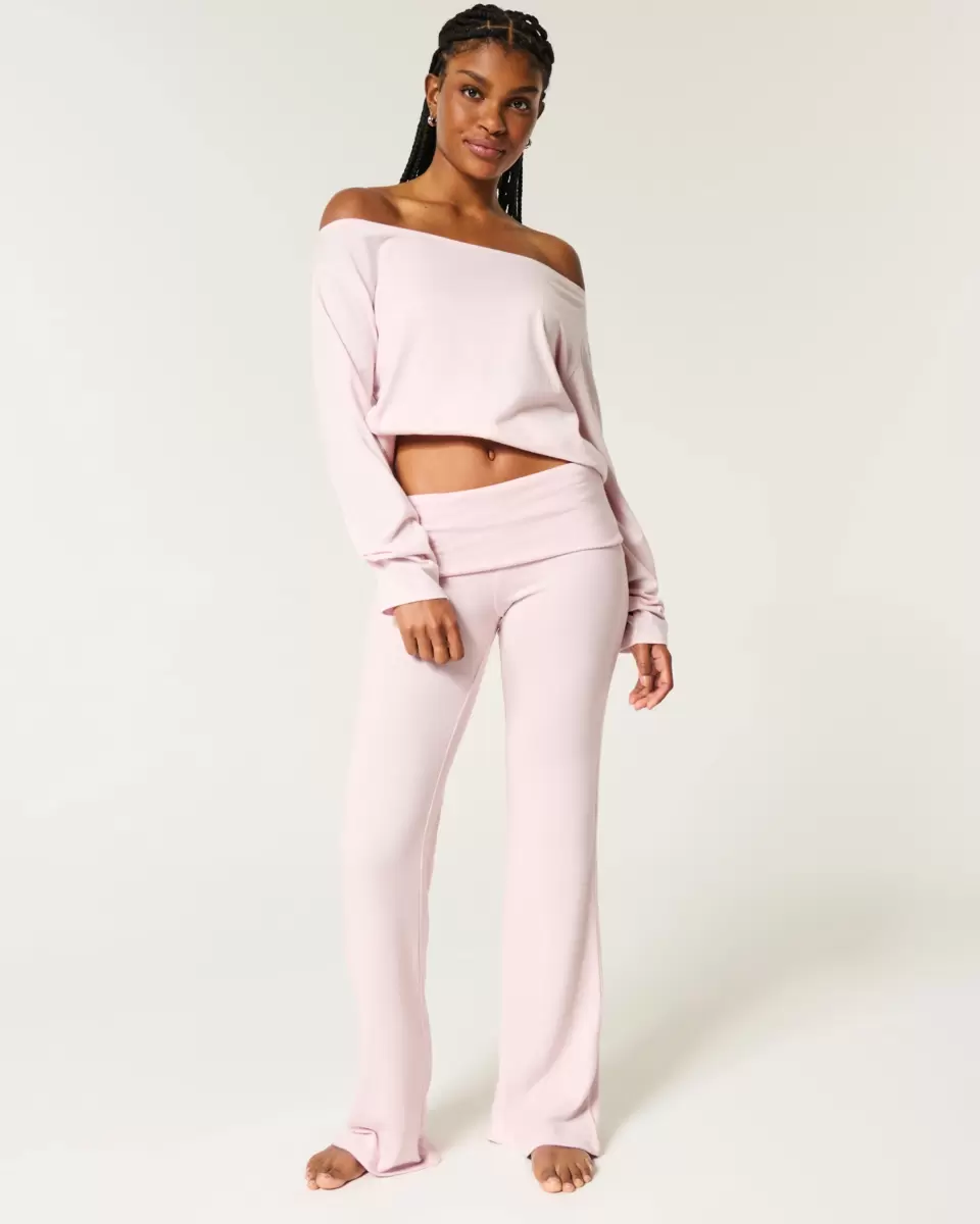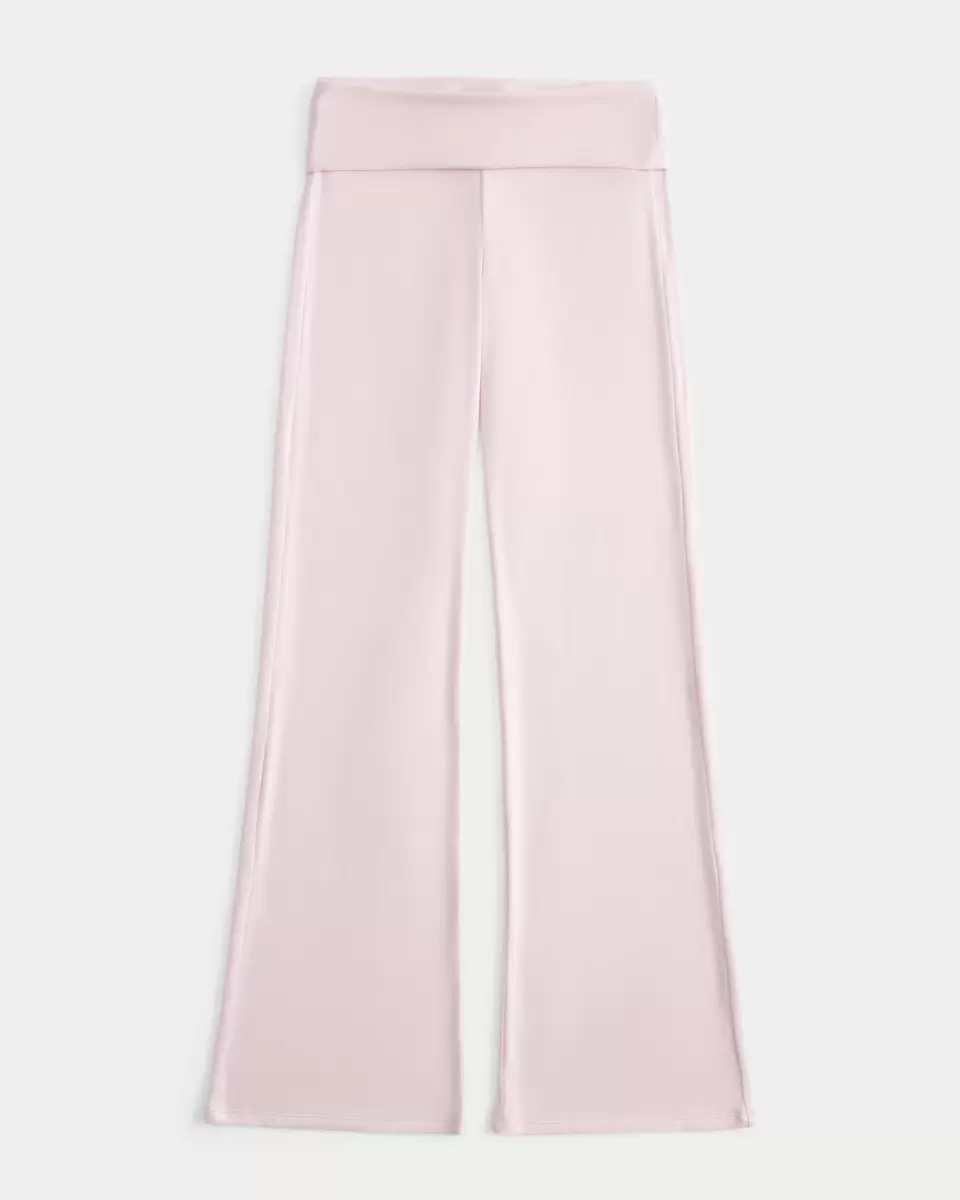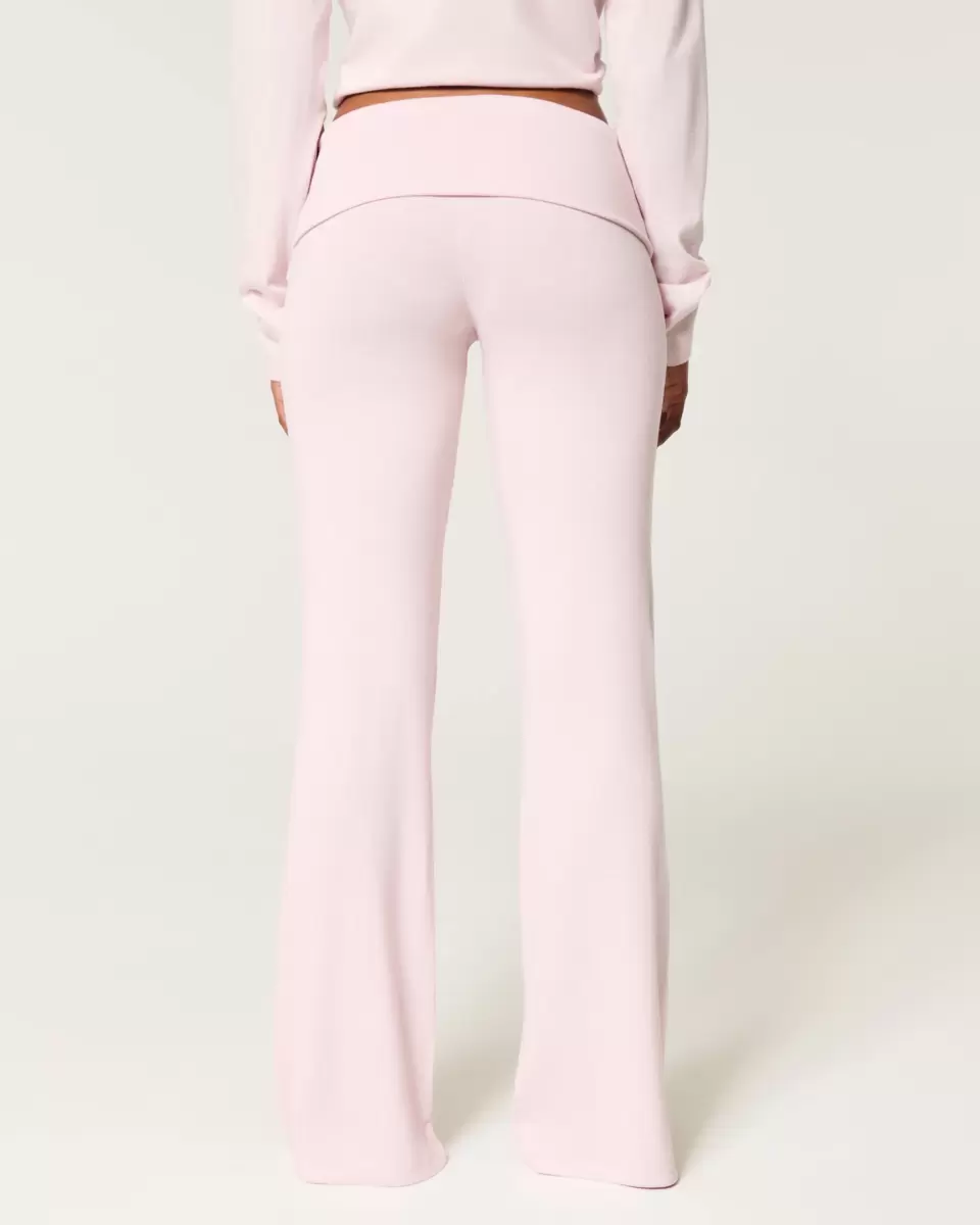 Super soft and cozy knit pants designed with a foldover waist and flared leg. Adjustable rise. Imported.