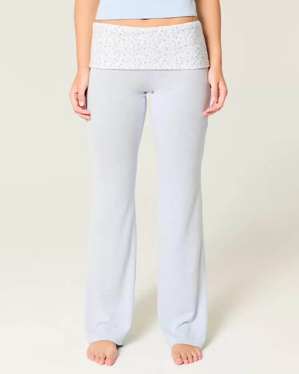 Cozy and super soft knit flare pants with a colorblock foldover waistband. Pockets, adjustable rise.