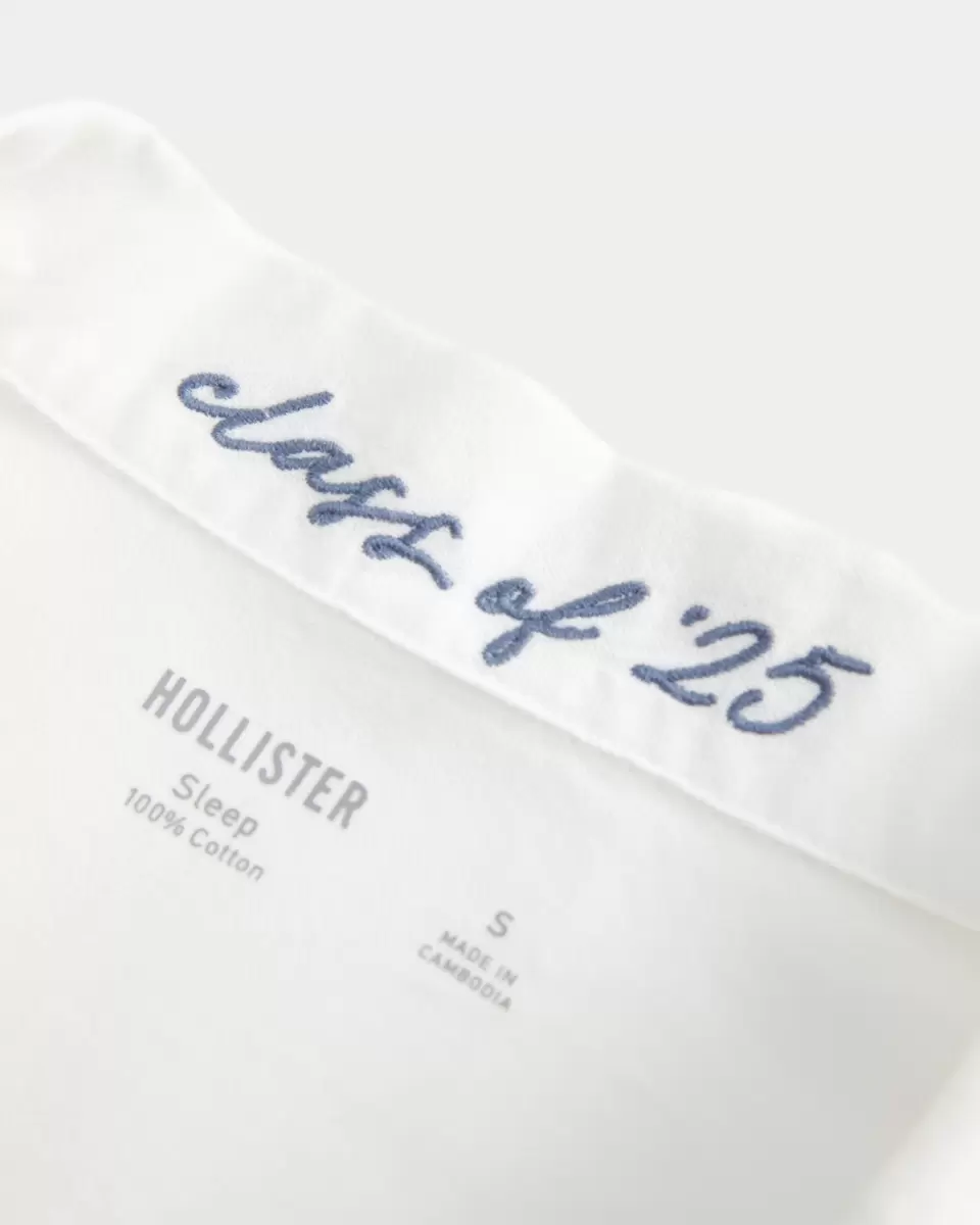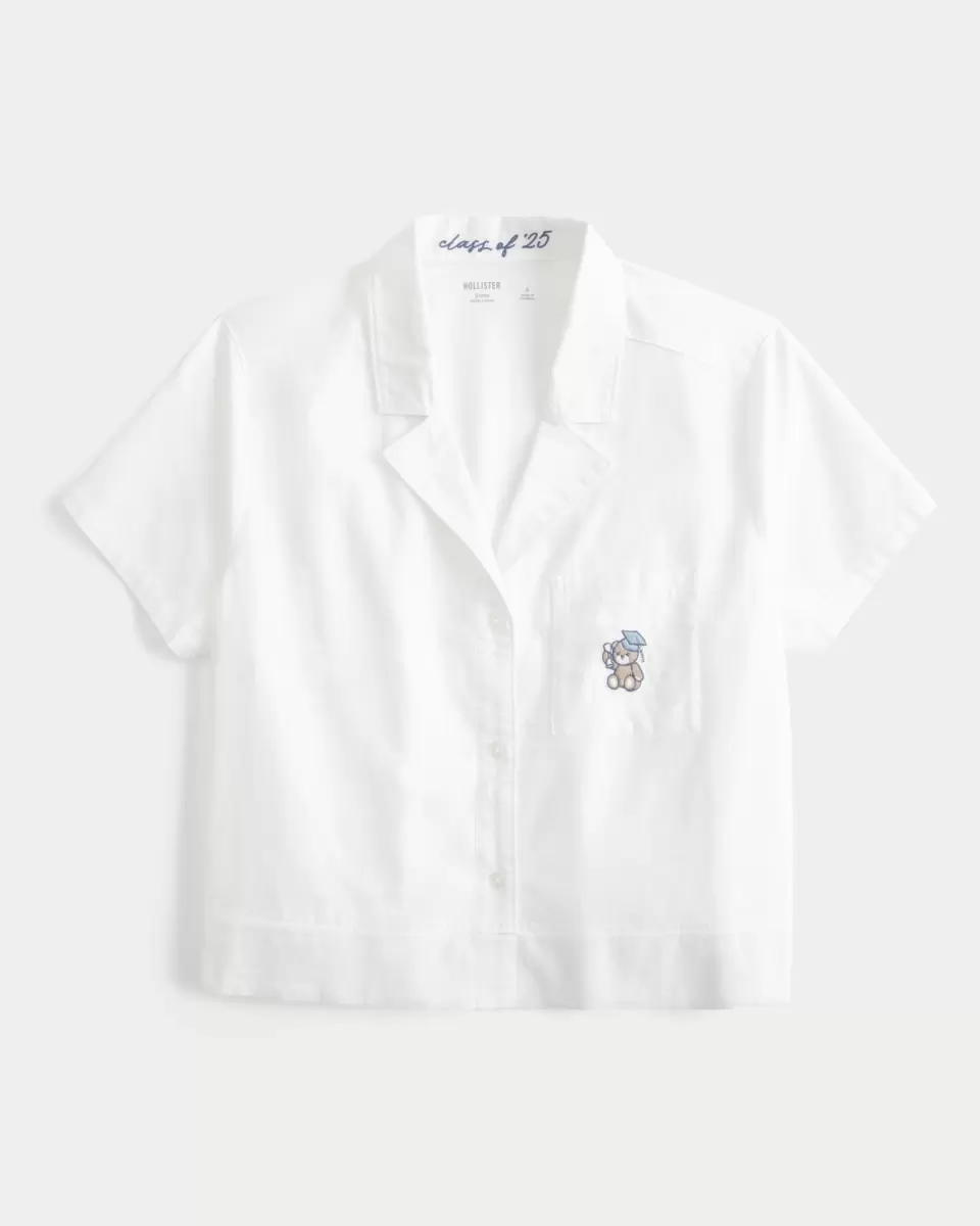 A cute sleep shirt in soft 100% cotton fabric with class of ’25 graphic embroidery at the inside collar and bear grad graphic embroidery at the left pocket. Button closure, collar, short sleeves, left chest pocket. Easy Fit. Imported.