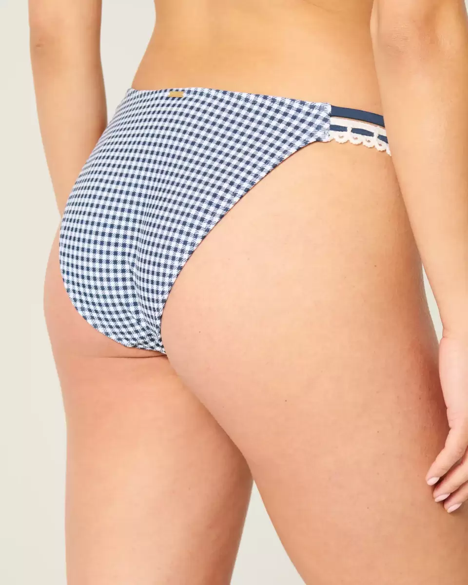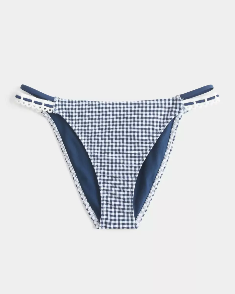 A cute bikini bottom featuring double side straps with crochet-style trim. Cheeky coverage. Imported.