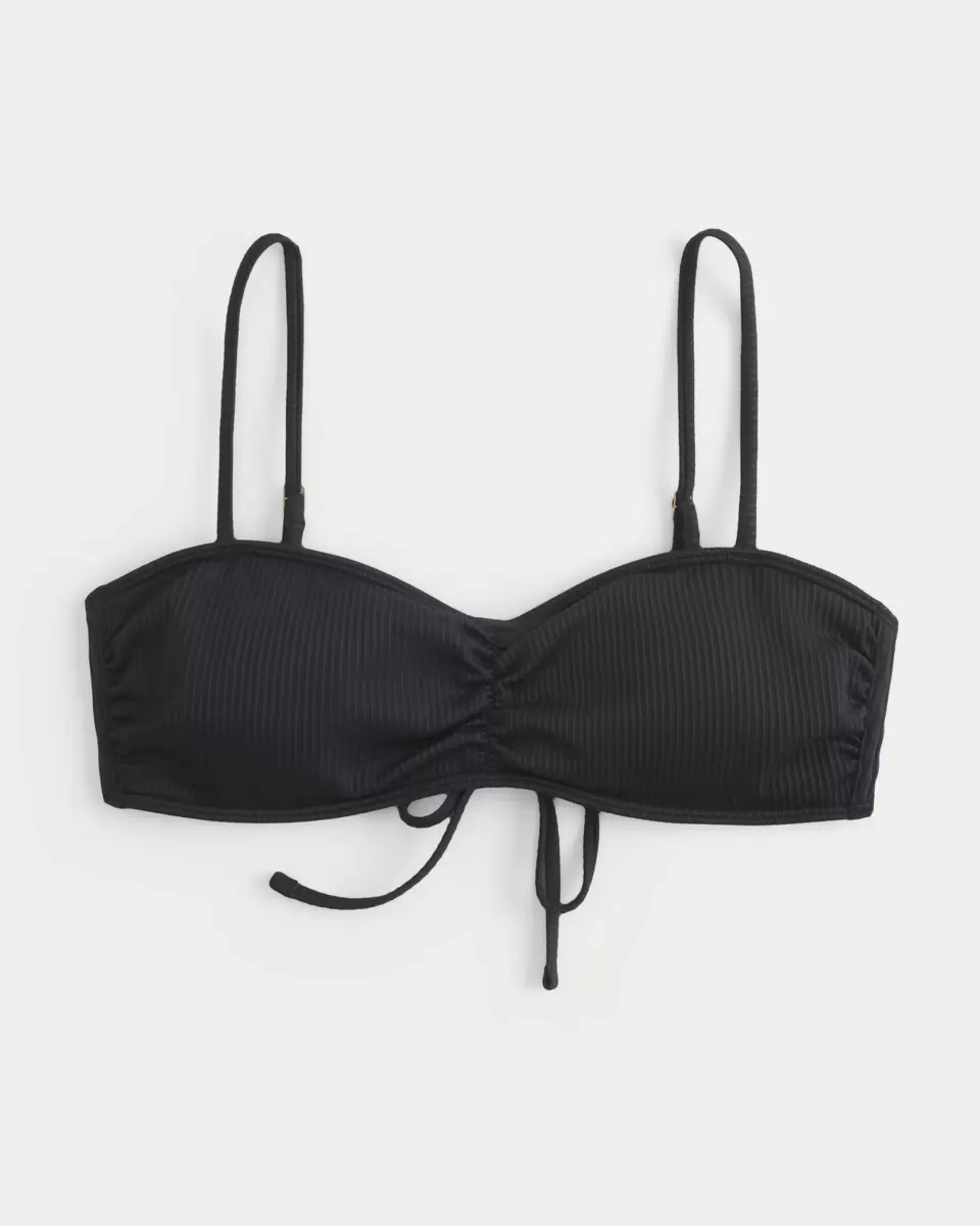 A super cute bikini top in soft ribbed swim fabric with a scoop neckline and cinched detailing at the center. Adjustable straps, tie back closure. Imported.