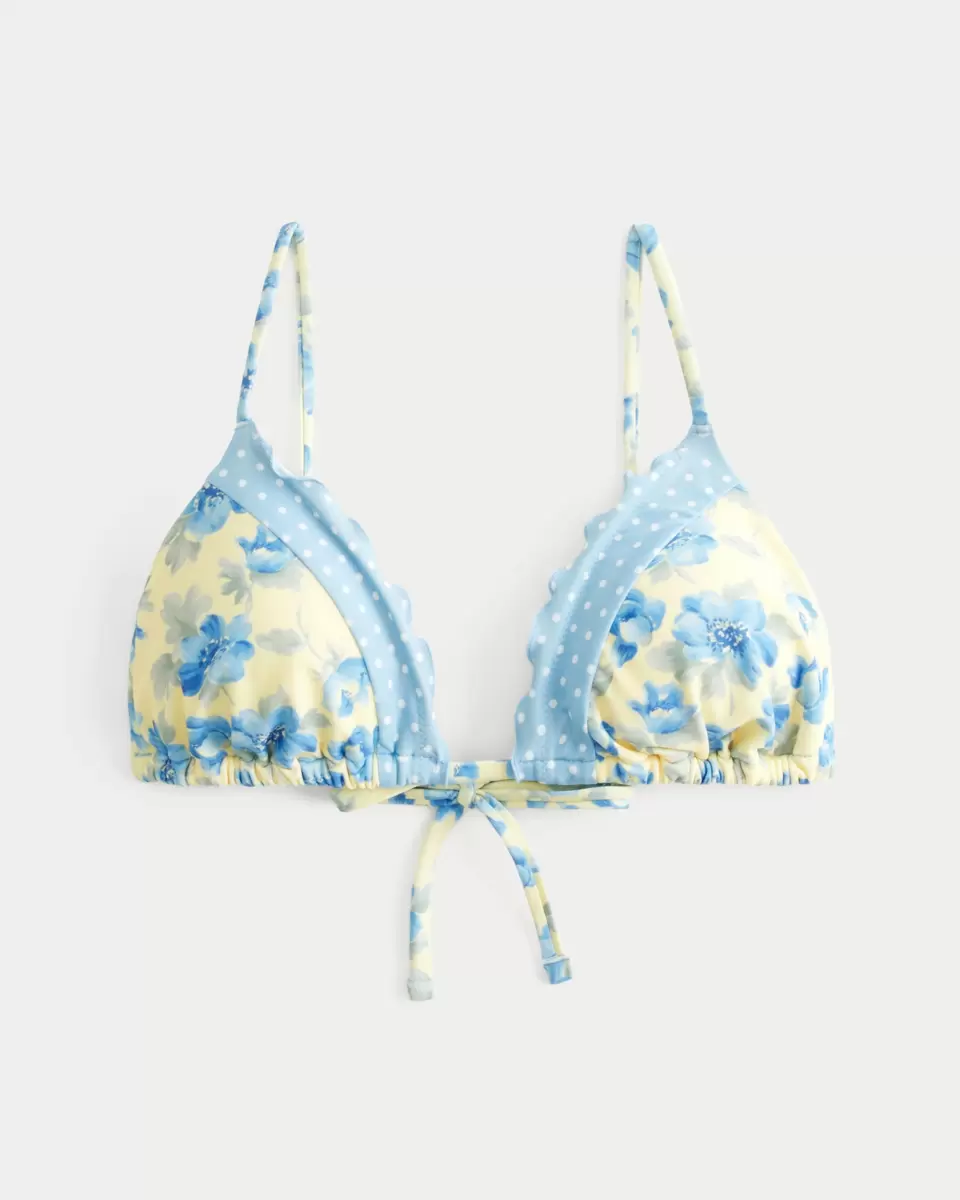 This pretty bikini top is designed with a triangle silhouette, spliced pattern detailing, cute ruffled edges and tie straps. Removable padding, tie back closure. Imported.