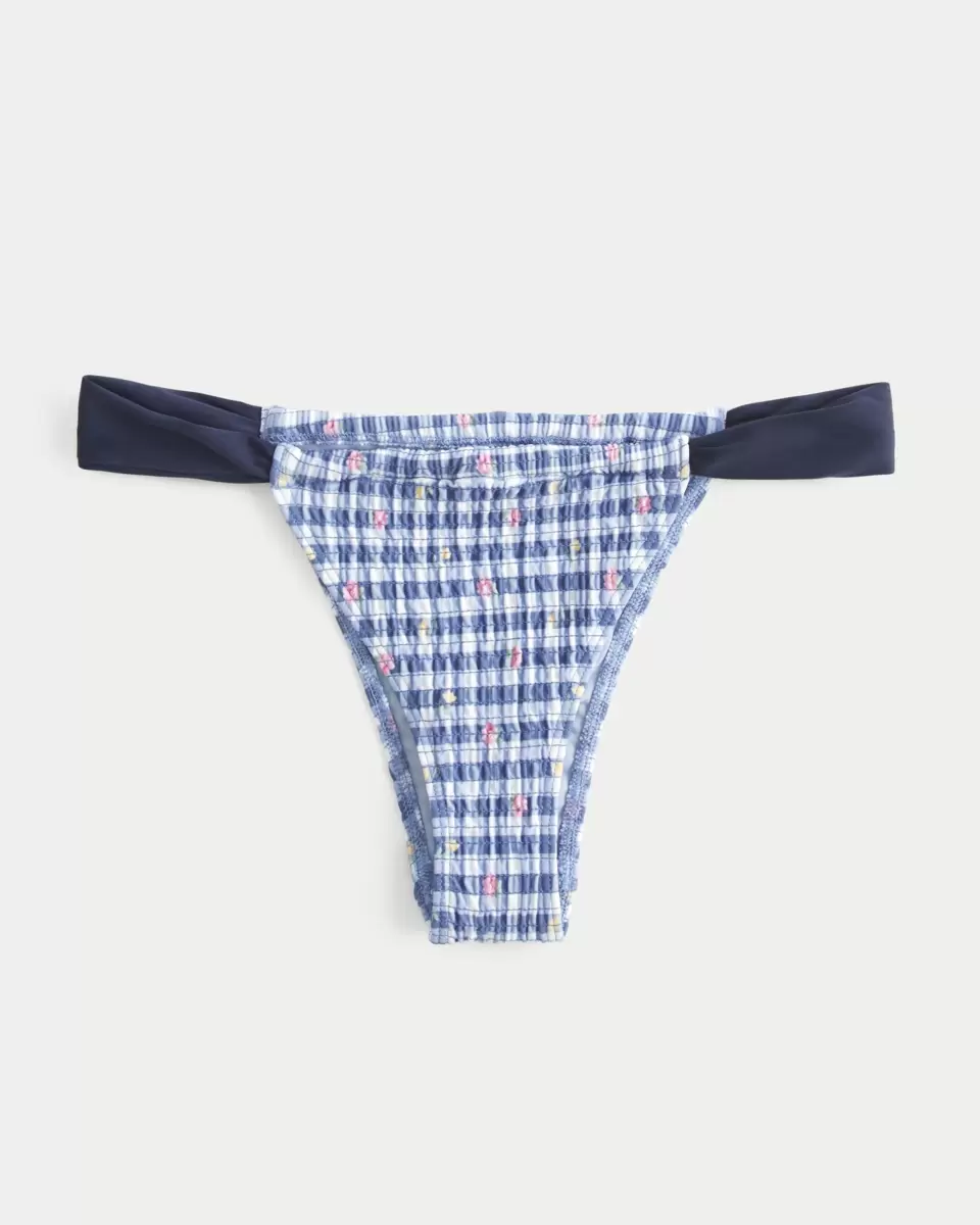 This cute and comfy bikini bottom is made with soft smocked swim fabric. Side straps, high-leg silhouette, cheekiest coverage. Imported.