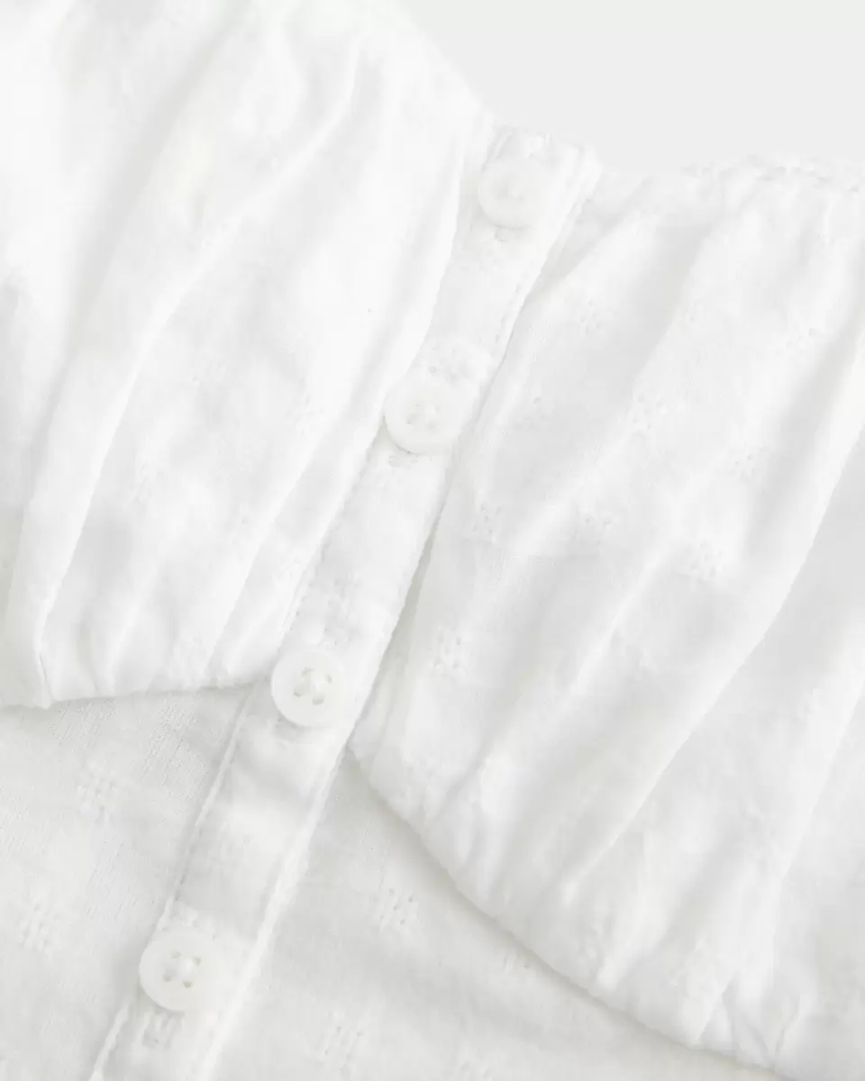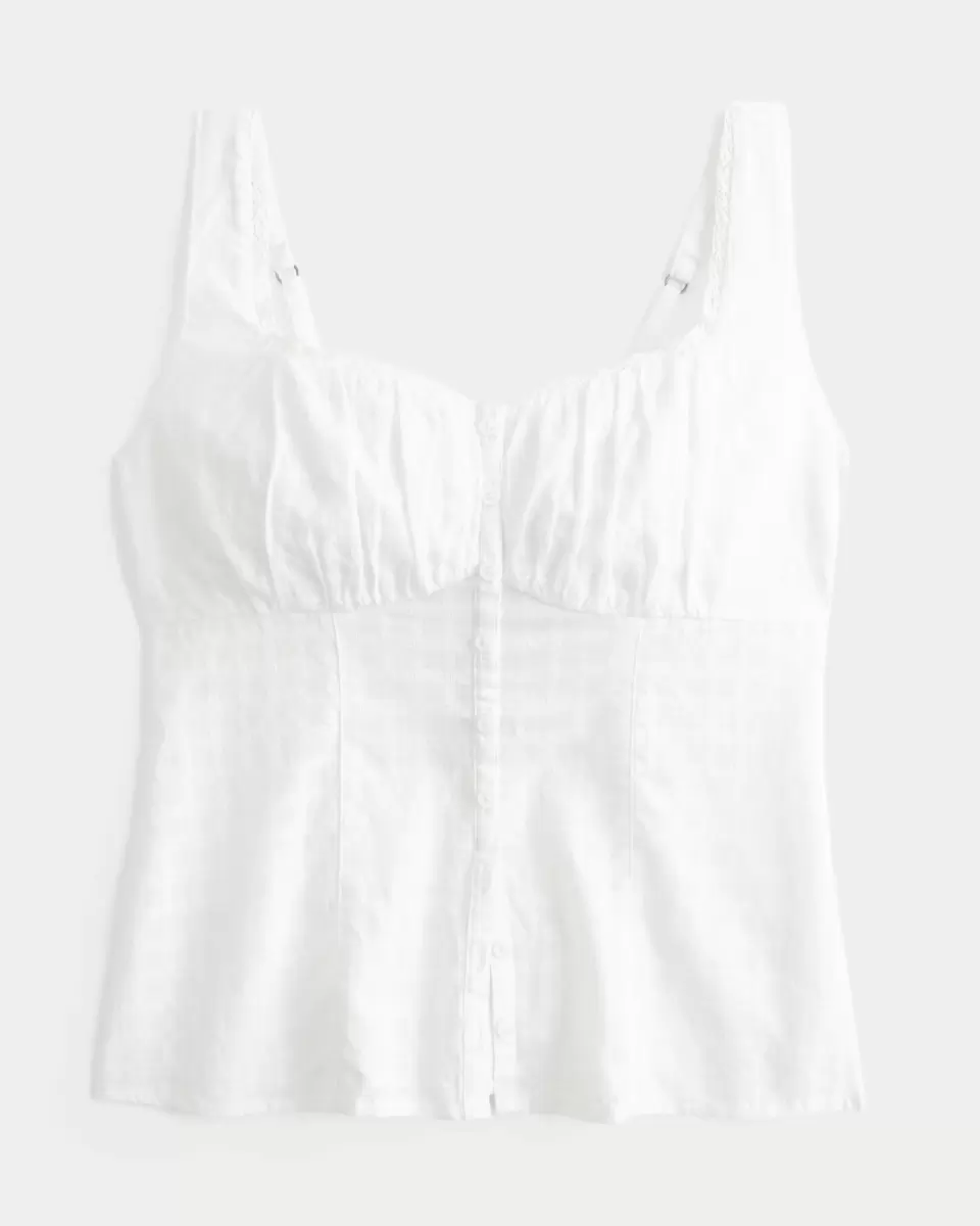This cute top is made with super soft crosshatch fabric and features ruched detailing through the bust. Button details, adjustable straps, lace trim along the neckline. Slim Fit. Imported.