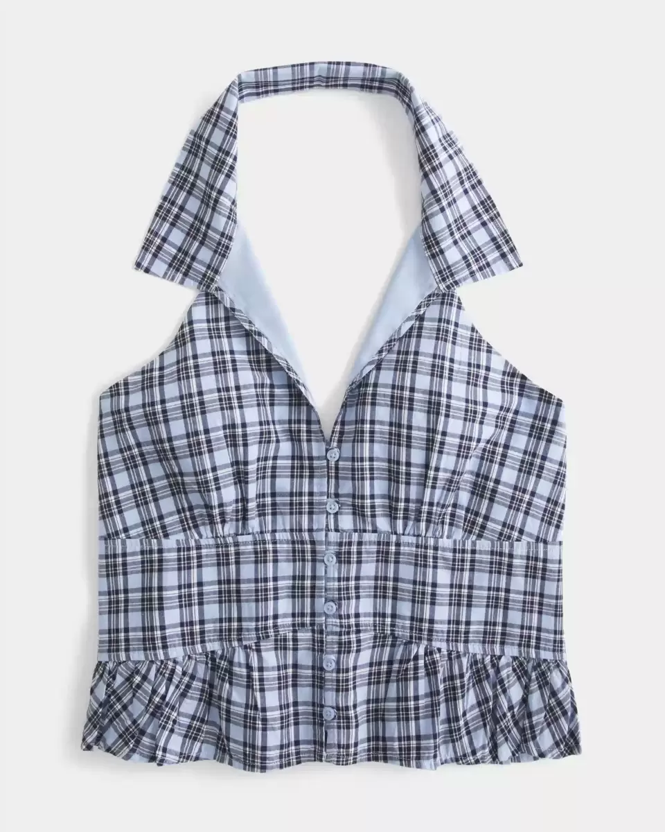 This pretty sleeveless blouse features a collared halter neckline and full button closure. Flowy hem. Easy Fit. Imported.