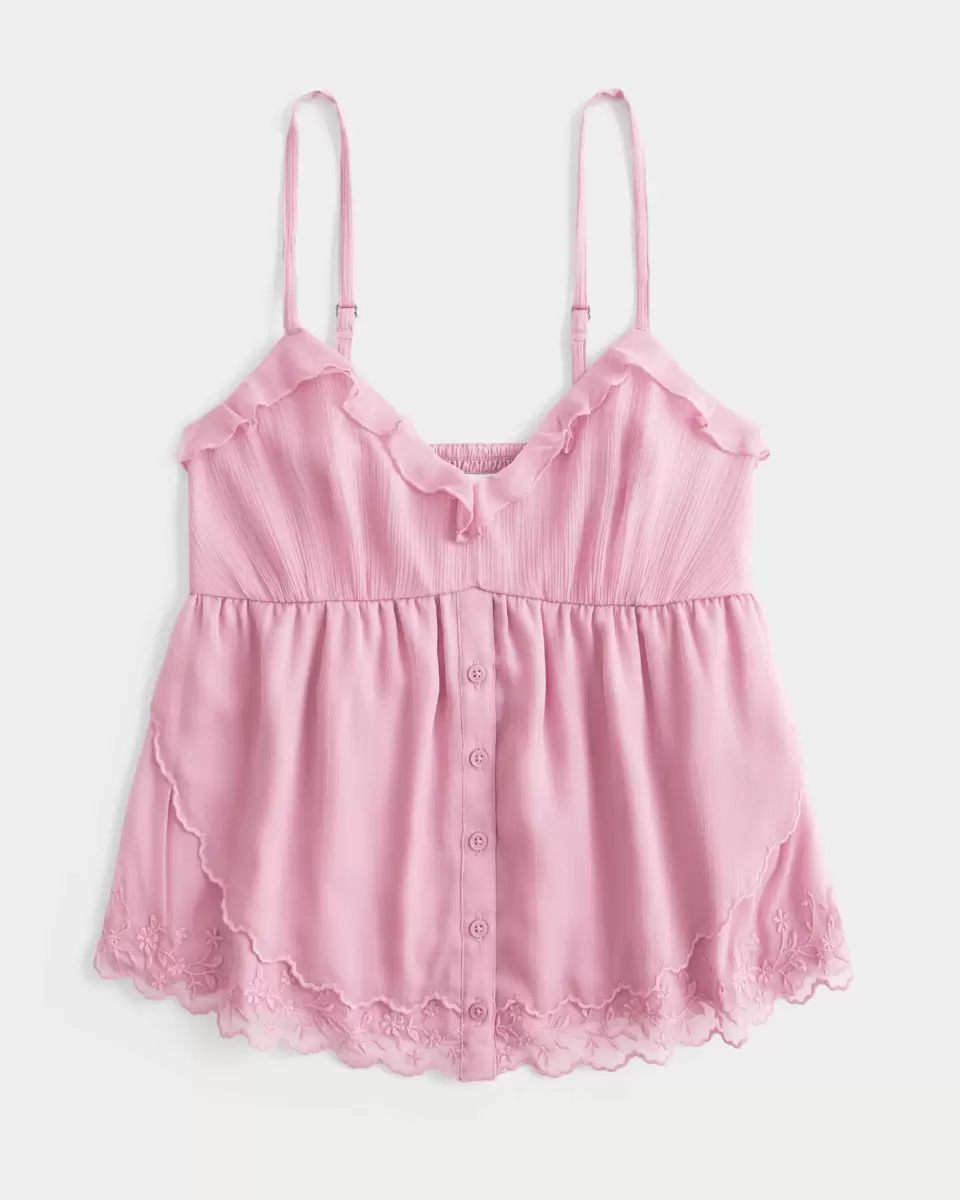 Made with super soft, flowy crinkle chiffon fabric, this babydoll top features ruffles and a tiered hem with embroidery. Button details, soft smocked back. Looks amazing dressed up or down! Imported.