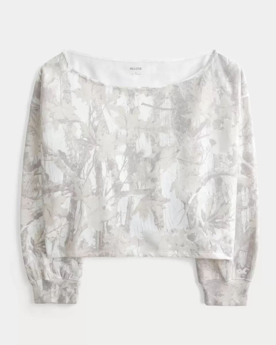 A super soft fleece sweatshirt featuring an all-over camo pattern and relaxed neckline that’s worn off both shoulders. Long sleeves. Easy Fit. Imported.