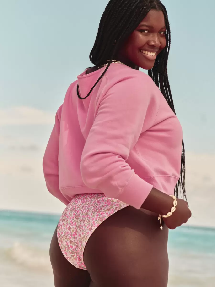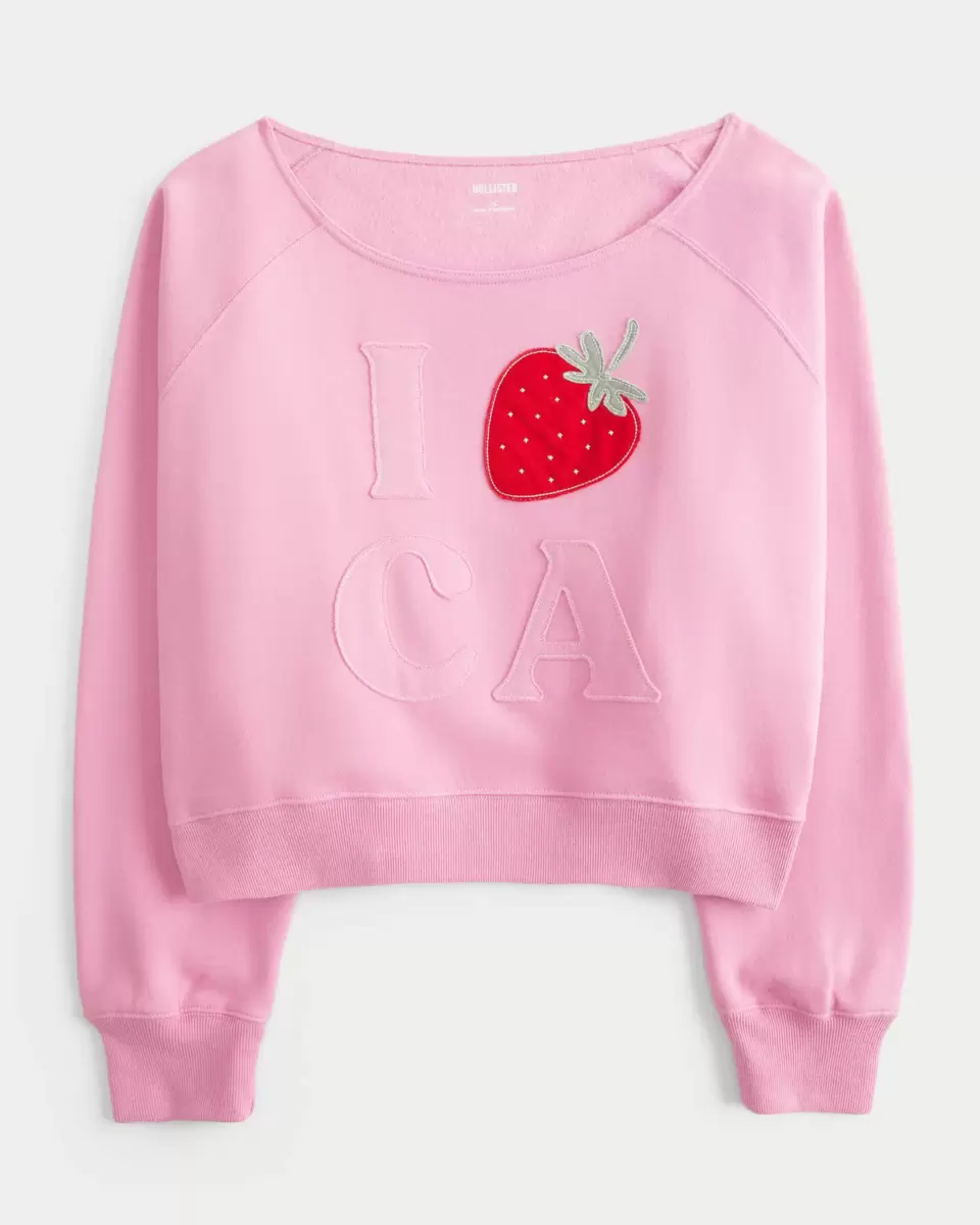 A super soft fleece sweatshirt featuring I Heart CA graphic applique with a cute berry detail. Off-the-shoulder neckline, long sleeves. Easy Fit.