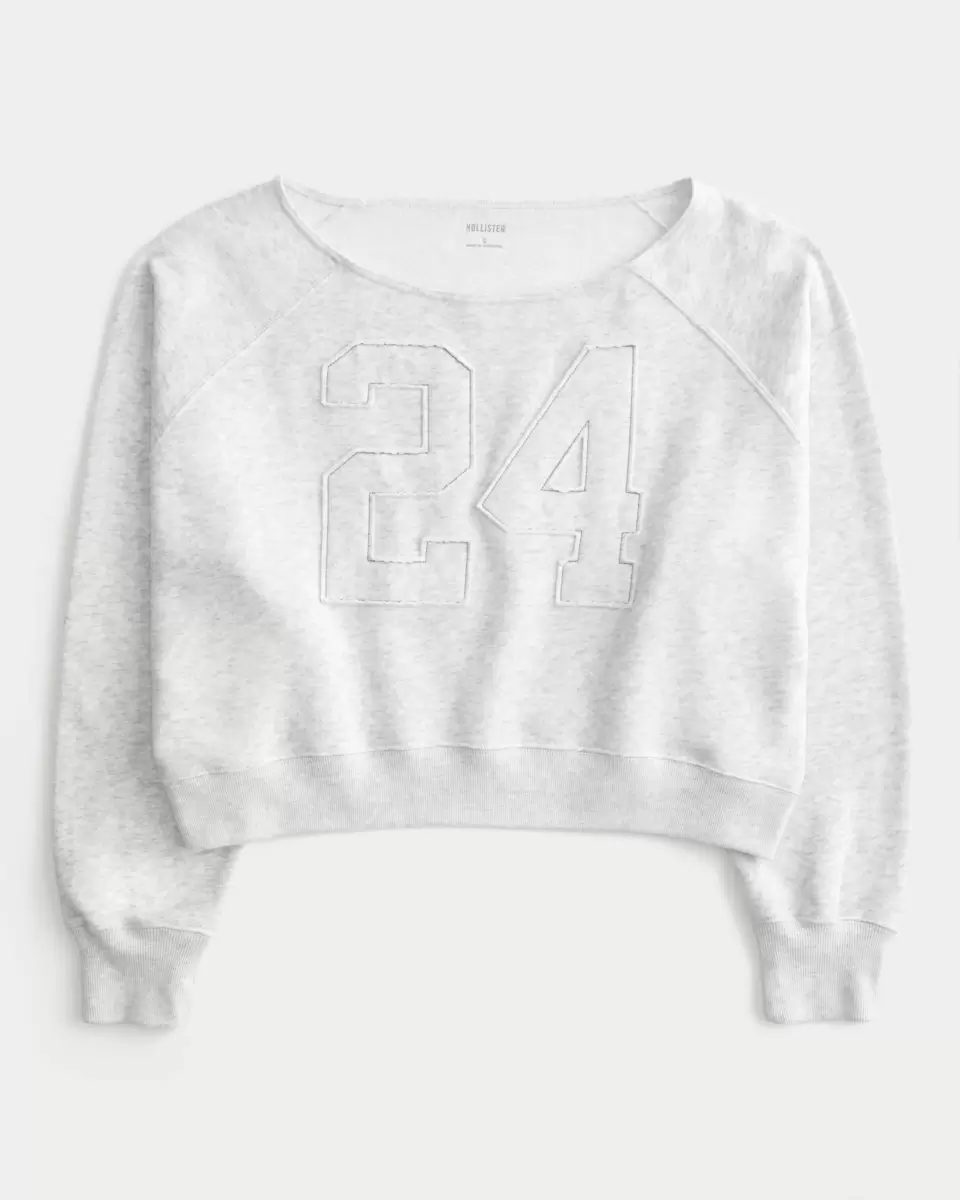 A super soft fleece sweatshirt with varsity-inspired number applique and an off-the-shoulder neckline. Long sleeves. Easy Fit.