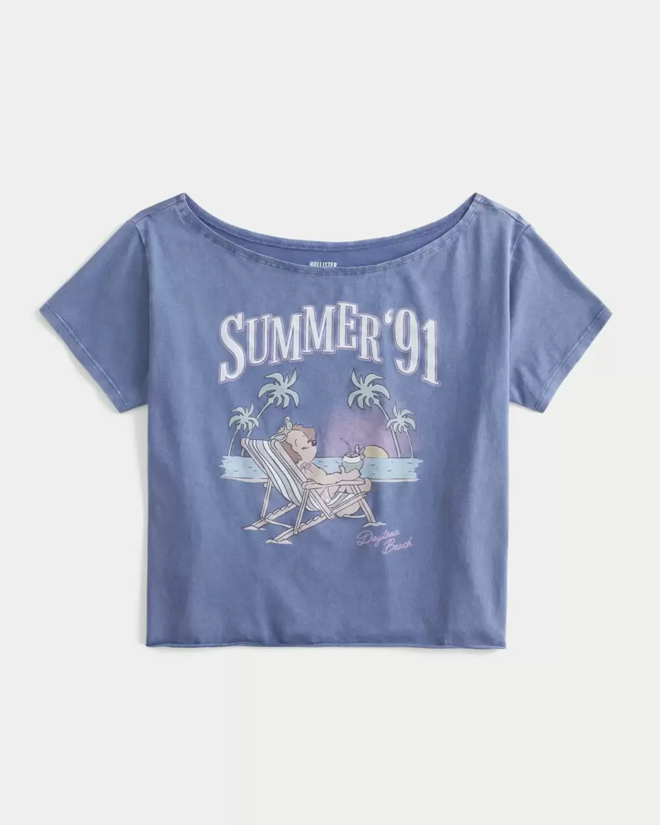 A super soft tee featuring an off-the-shoulder neckline and Summer ’91 print graphics. Short sleeves. Easy Fit.