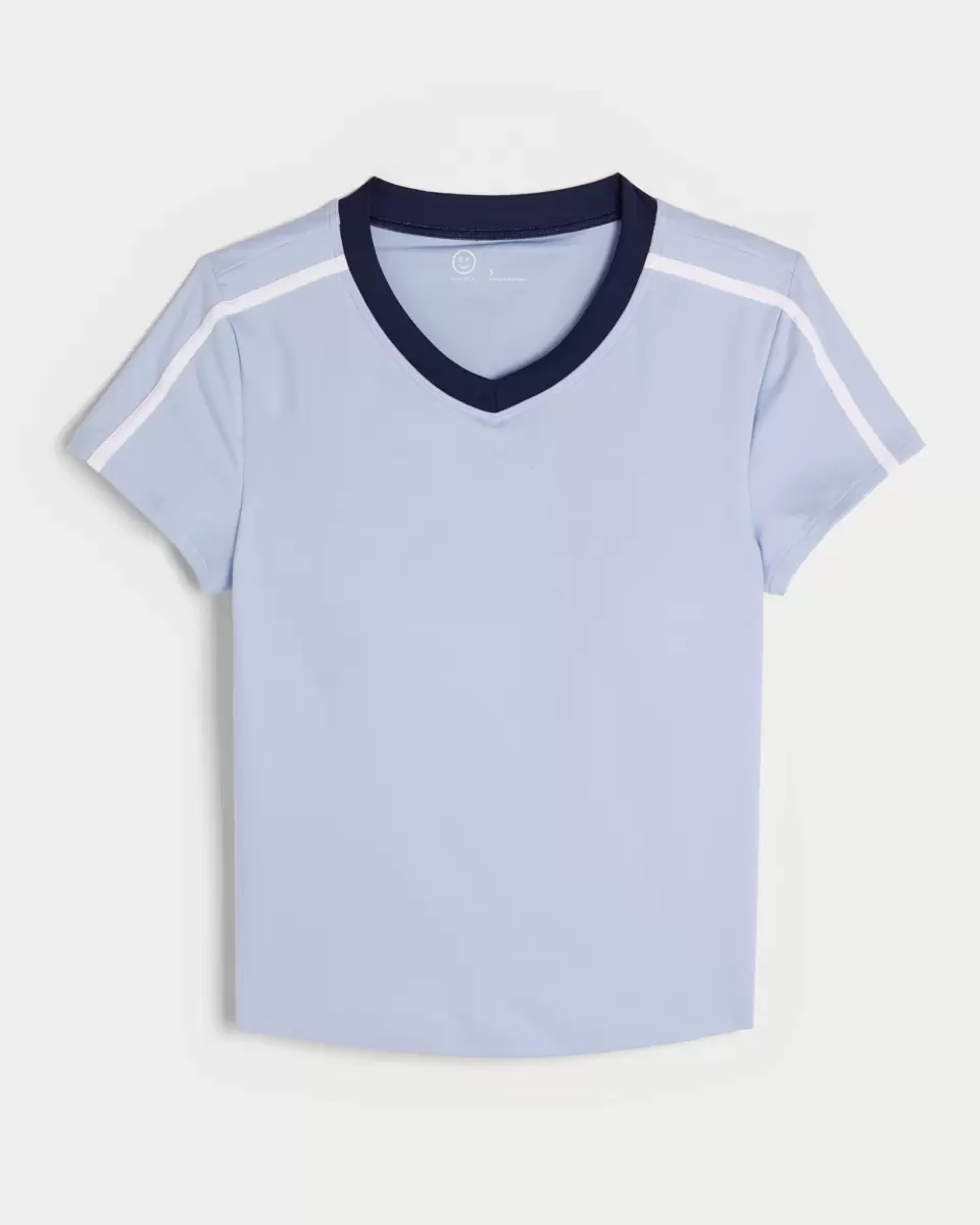 This super soft and comfy baby tee features a v-neckline and sporty stripe along the sleeves. Short sleeves, built-in shelf bra with removable pads. Imported.