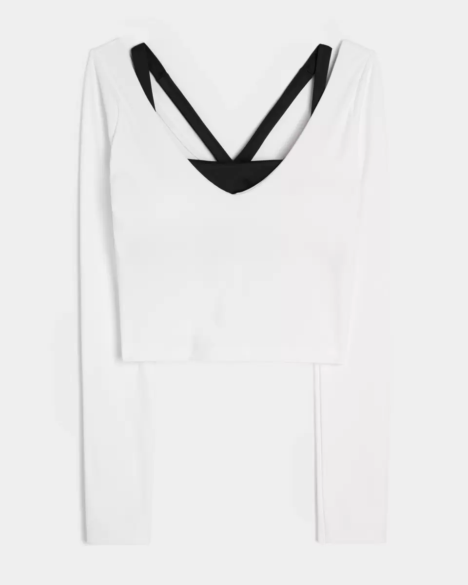 This super cute top is designed in our breathable, 4-way stretch, moisture-wicking Boost fabric with a super soft, brushed feel. Layered straps, built-in shelf bra with removable pads, long sleeves. Imported.